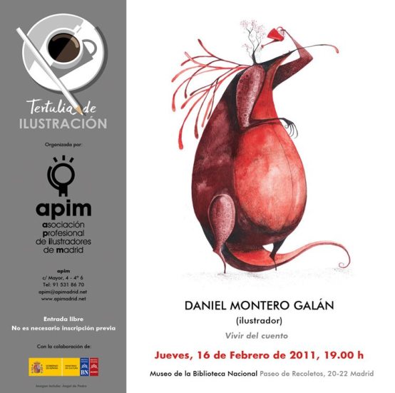 El próximo jueves 16 de febrero a las 19h. en el Museo de la Biblioteca Nacional, dentro de las tertulias organizadas por la Asociación Profesional de Ilustradores de Madrid, el ilustrador Daniel Montero Galán compartirá sus impresiones sobre su trabajo como ilustrador.