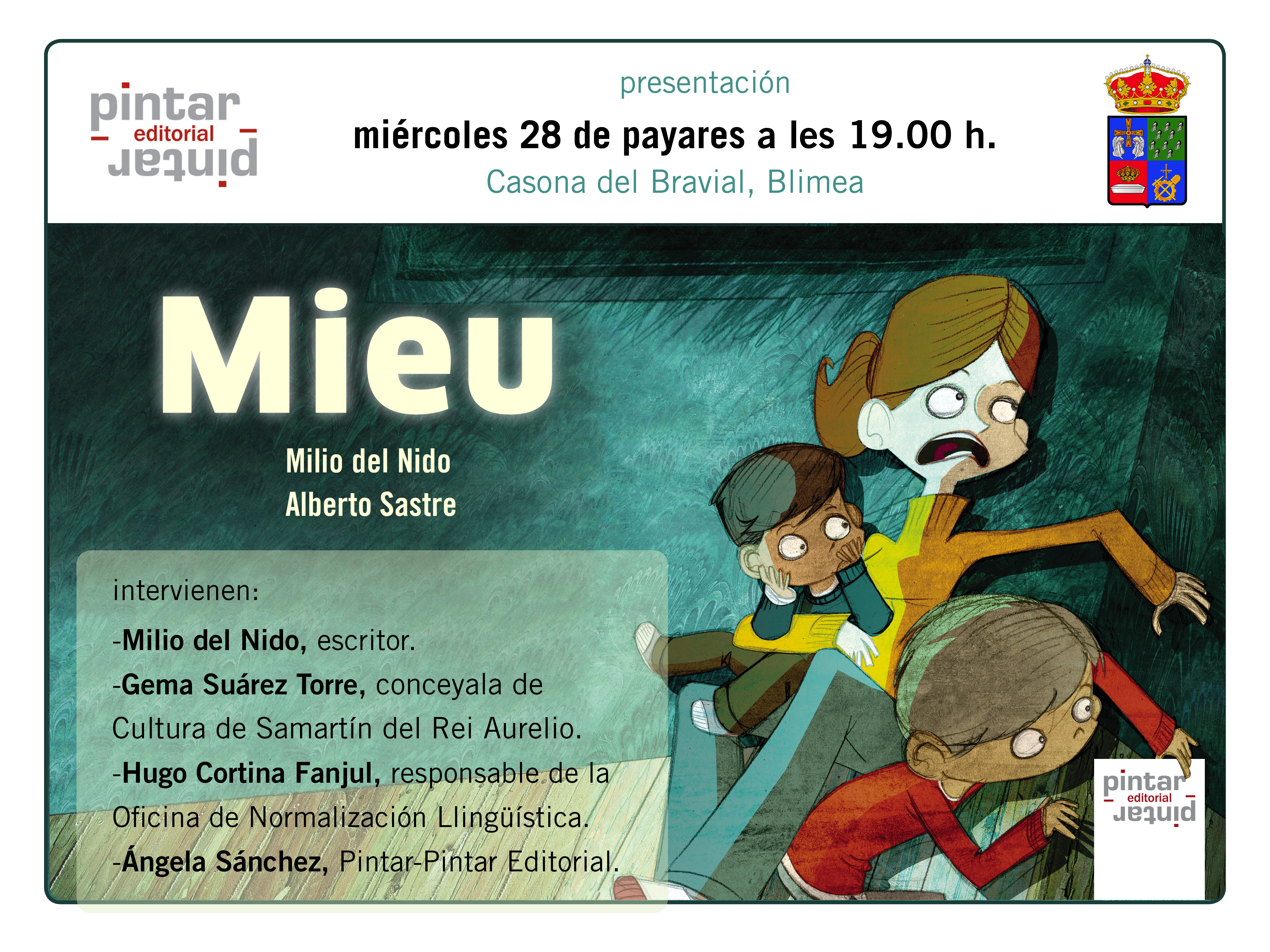 El próximu miércoles 28 de payares, a les 19.00 h. vamos presentar na Casona del Bravial de Blimea, l’álbum ilustráu tituláu «Mieu» del escritor Milio del Nido y l’ilustrador Alberto Sastre.