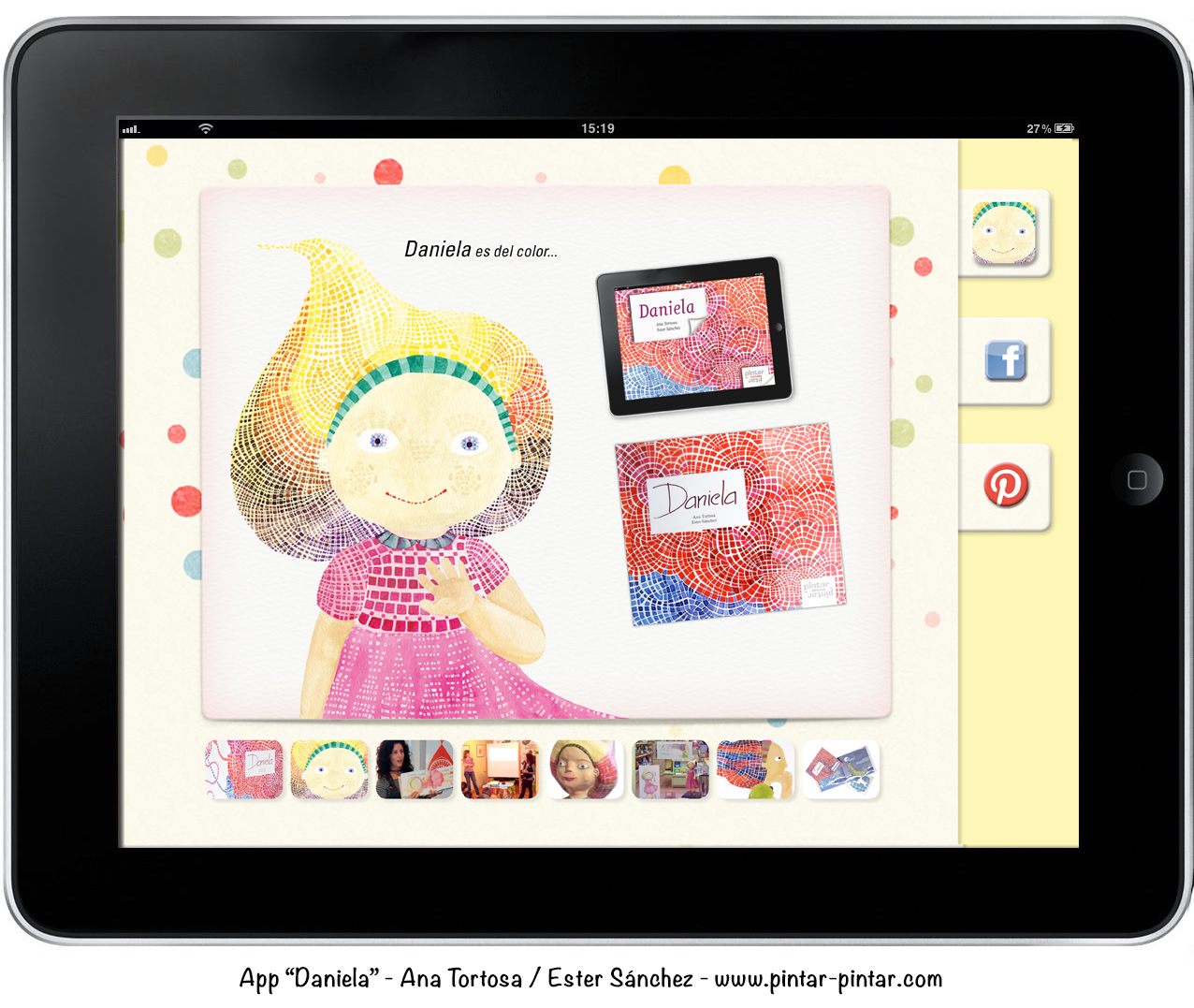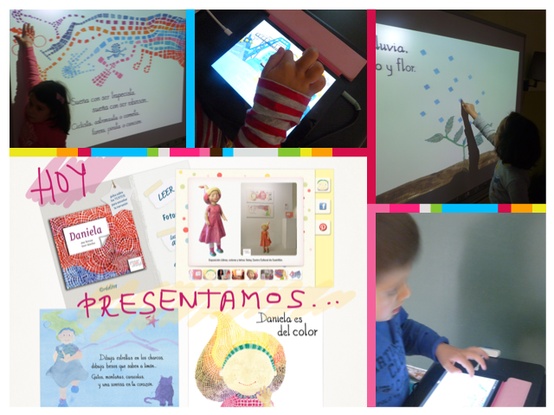 Este mágico libro, se ha transformado, con un abra cadabra, en una App, y hoy hemos tenido la ocasión de trabajarlo en el aula con niños de 4 años. Conocedores del libro en formato papel, ha sido toda una sorpresa, verlo proyectodo en la PDI, con movimientos, con sonidos y música nos ha hecho realizar una sesión de las que llamamos «redondas», el juego que da es infinito. La proyección y disfrute de la escucha, de la narración cuidada, de la música elegida con mimo, de la interacción…ya es por sí misma merecedora del título de Guappi, pero es que después hemos trabajado el vocabulario, abundante y rico, acompañado por las geniales ilustraciones de Esther; a modo de ejemplo, las figuras que viven en el pelo de Daniela y con las que ella sueña: el trapecista, el ciclista, el astronauta, la cometa…..se prestan para su búsqueda y localización, para una vez encontradas en la PDI, pasen a la tableta y toquen en la figura y……..la magia aparece de nuevo¡¡¡¡ el detalle de la la nota musical es todo un acierto…y no os cuento más porque me gustaría que, quienes tengais la ocasión, podáis utilizarla en el aula y disfutar tanto como lo hemos hecho nosotros. os dejo unas fotos de la sesión, espero que os guste. El precio de esta App para Ipad es de 1,79 e.