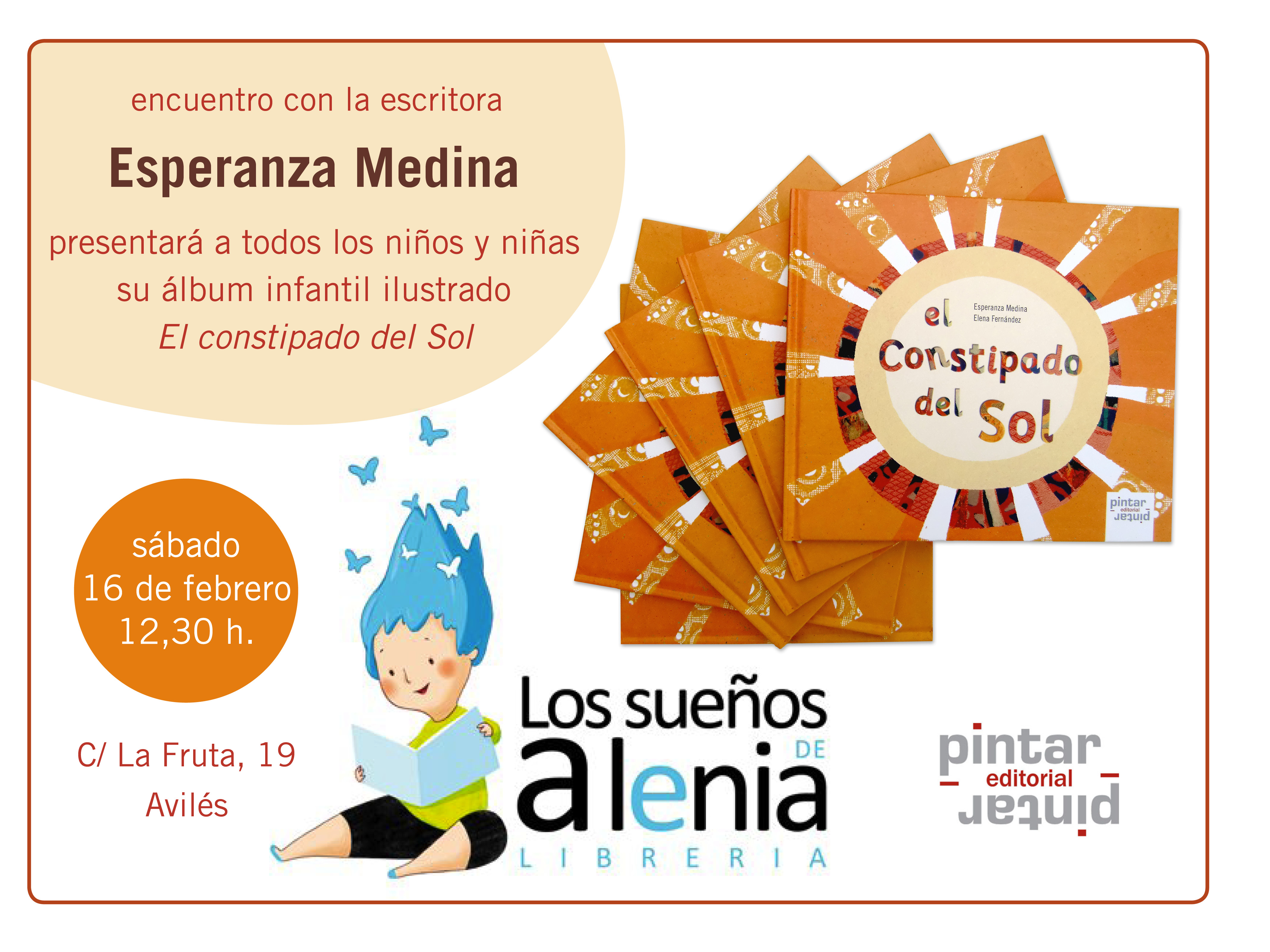 El próximo sábado 16 de febrero a las 12,30 h en la librería Los Sueños de Alenia en Avilés, tendrá lugar un encuentro de la escritora Esperanza Medina con todos los niños y niñas que crean puedan darnos una solución para sanar El constipado del Sol. ¿Nos ayudas?