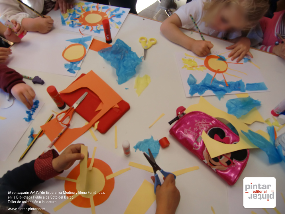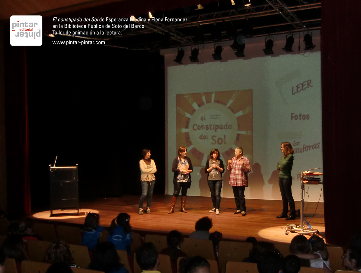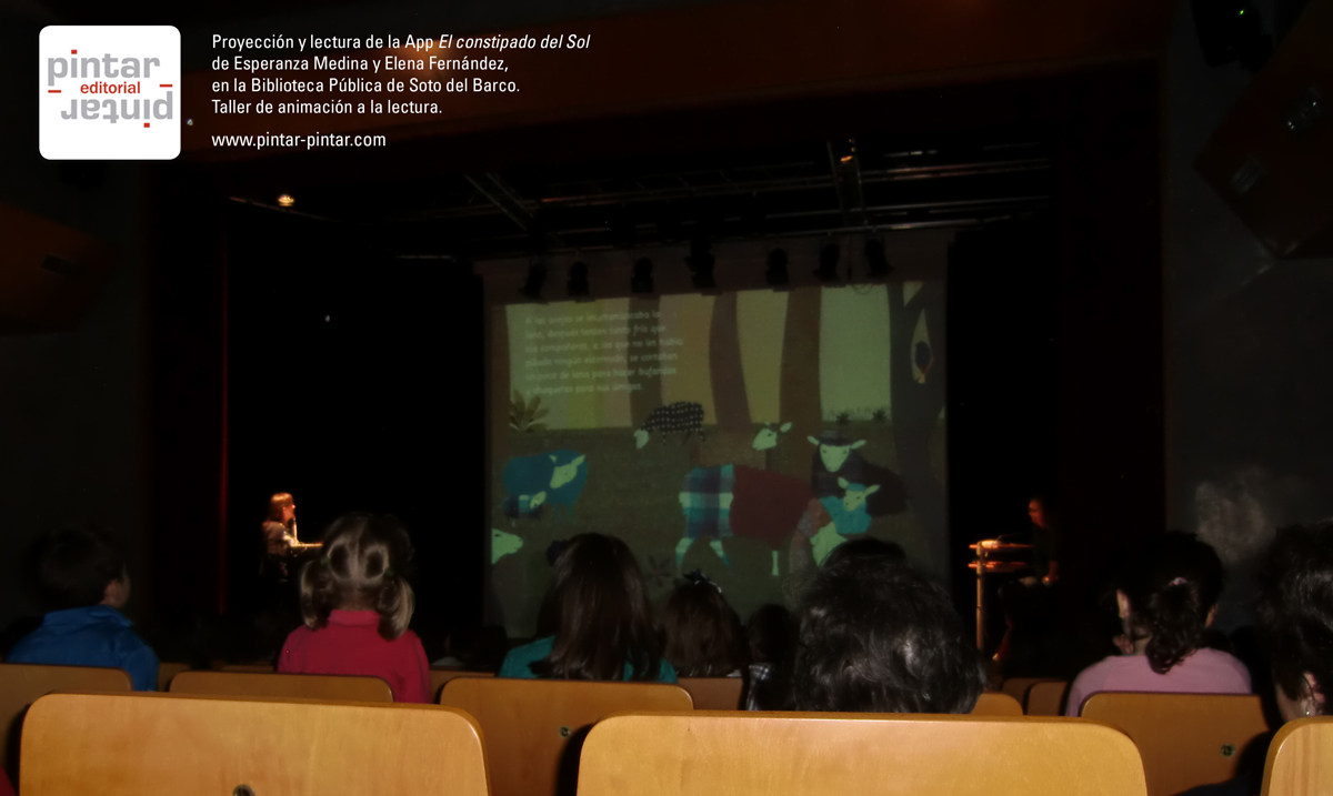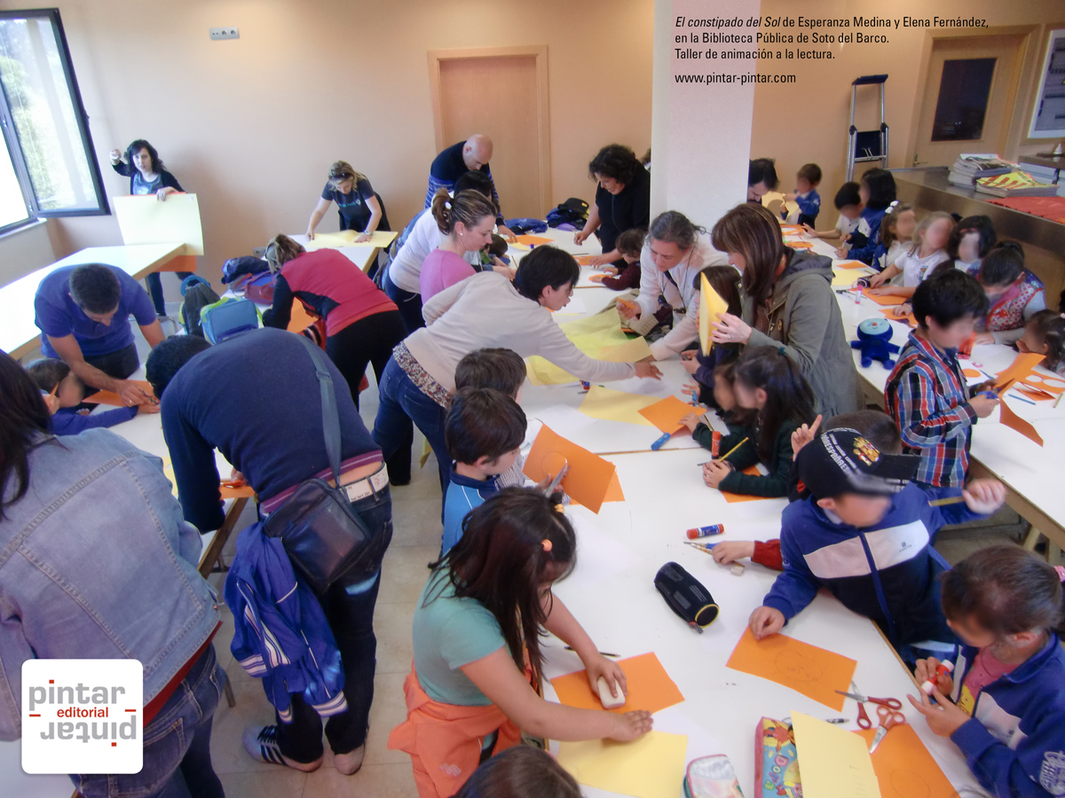Y mientras la escritora Ángela Sánchez realizaba una nueva sesión de Kamishibai en la Biblioteca de San Lázaro (Oviedo), a las 6 de la tarde en la Biblioteca de Soto del Barco, llegó el plato fuerte de la celabración del Día del Libro. Allí tuvimos la suerte de poder acompañar a la escritora Esperanza Medina y a la ilustradora Elena Fernandez en una «lectura interactiva» y taller de su álbum ilustrado «El constipado del Sol».