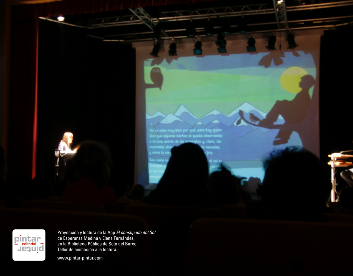 Leemos y proyectamos la App del libro «El constipado del Sol». Los niños y niñas quedan encantados con su lectura y con las animaciones del libro.