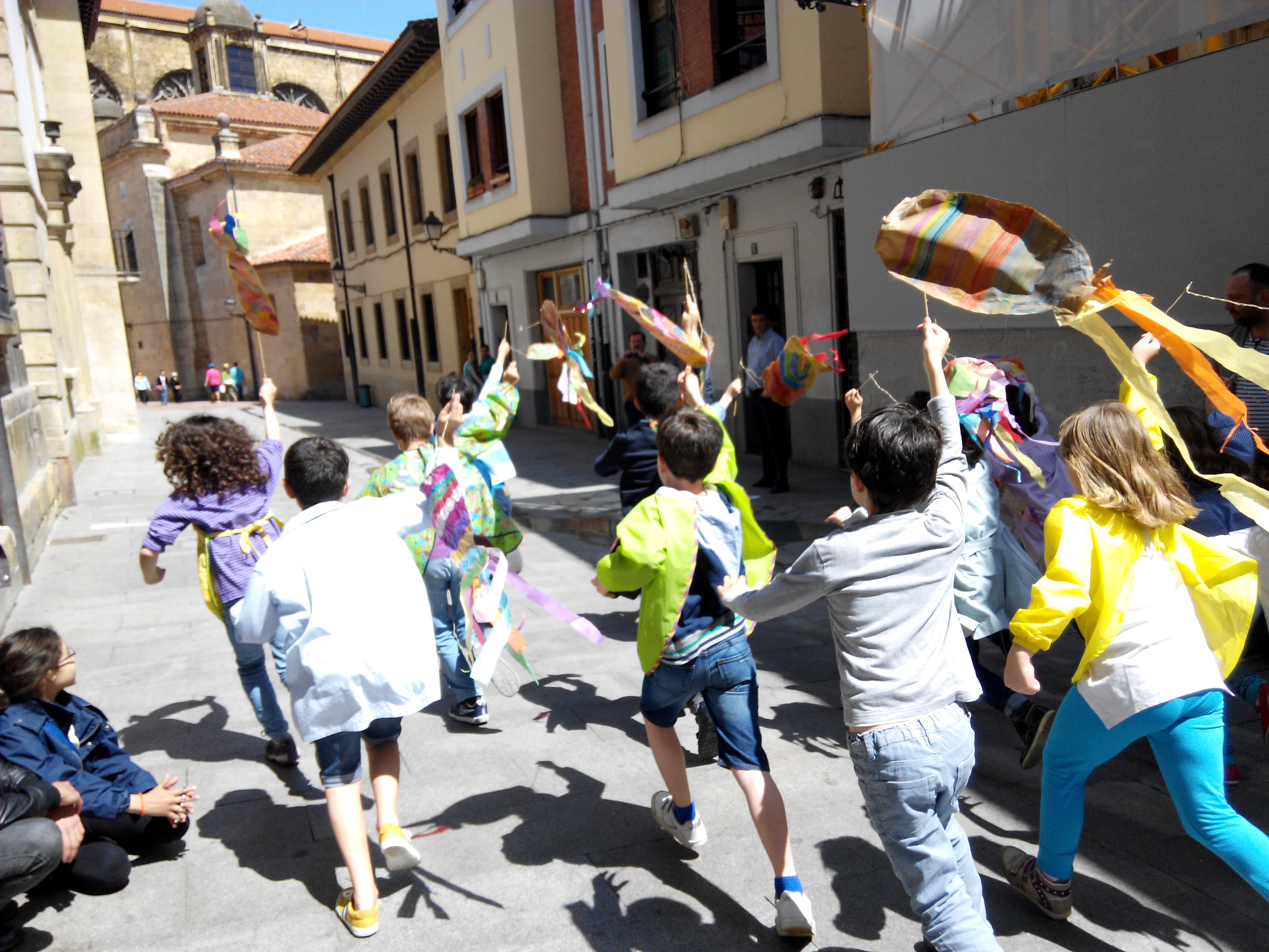 Le agradecimos su visita, nos sacamos una foto todos juntos y volvimos a nuestro taller a terminar nuestras carpas. Una vez terminadas, había que probar si funcionaban, así que salimos a la calle a nadar con nuestros peces.