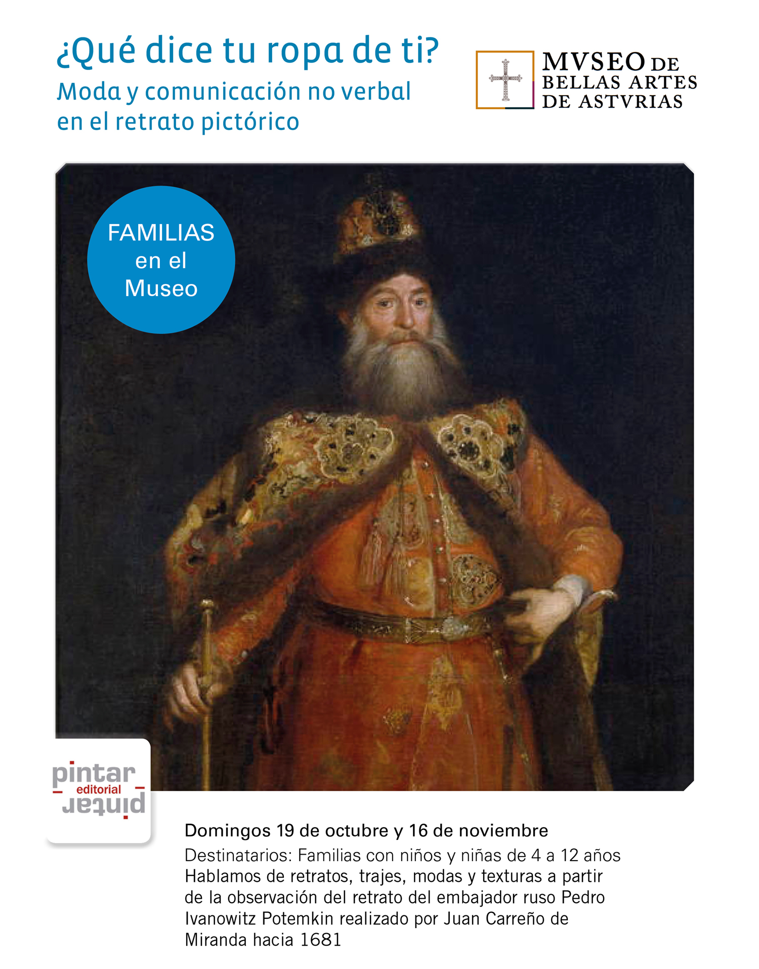 ¿QUÉ DICE TU ROPA DE TI? MODA Y COMUNICACIÓN NO VERBAL EN EL RETRATO PICTÓRICO es una experiencia didáctica en torno a la Obra invitada que, procedente del Museo Nacional del Prado, nos acompañará durante el otoño de 2014. A través de ella hablaremos de retratos, trajes, modas y texturas a partir de la observación del retrato del embajador ruso Pedro Ivanowitz Potemkin realizado por Juan Carreño de Miranda hacia 1681. Más información y reservas en la web del Museo de Bellas Artes de Asturias. La participación en todas las actividades y la entrada al Museo son gratuitas.