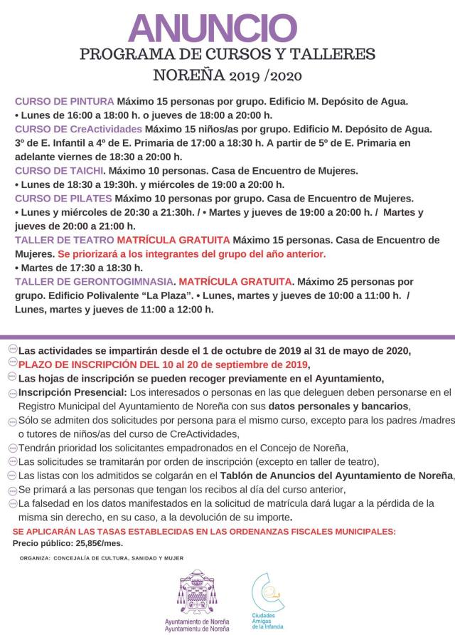 - INSCRIPCIÓN: del 10 al 20 de septiembre en el Ayuntamiento de Noreña. Horario de atención al público: 9:00 a 14:00 h
