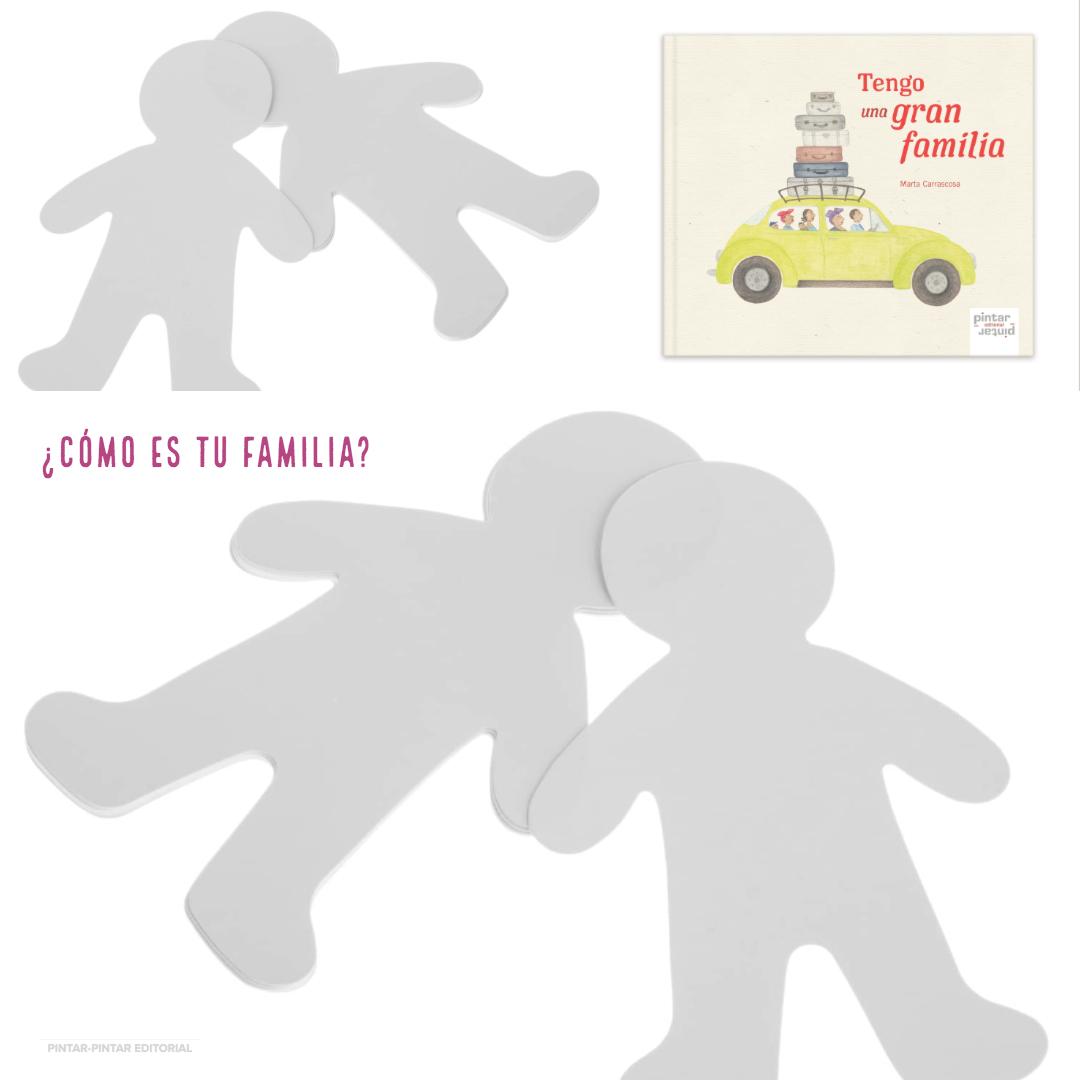 Leemos el álbum ilustrado Tengo una gran familia escrito e ilustrado por Marta Carrascosa y hablamos de los diferentes tipos de familias ¿cómo es tu familia? ¿Cuántos integrantes tiene? Cada participante recibirá 6 figuras de cartón de 500 g/m2 sin decorar para representar una familia. Animación a la lectura + taller relacionado