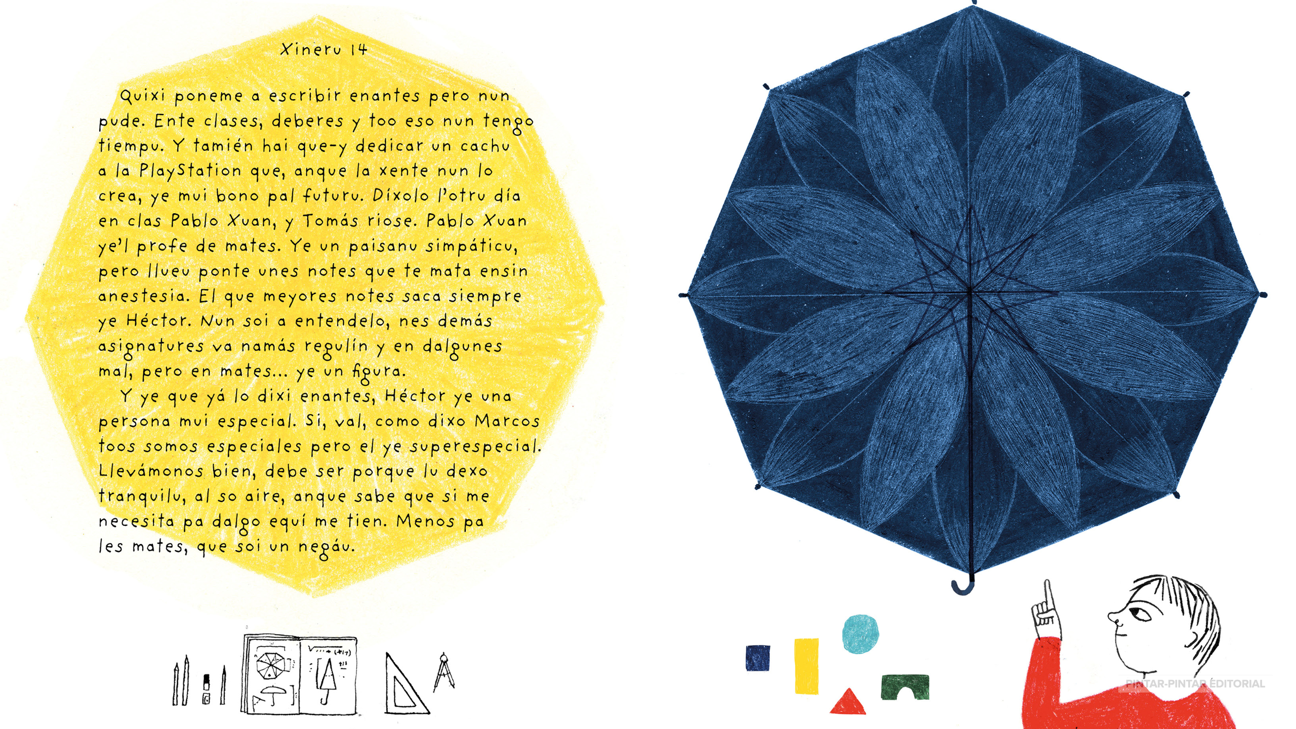 RESUME: Simón por fin tien un diariu, pero ún de verdá, d’esos con tapes dures y un candáu que amarra secretos como si fueren d’oru. Asina, Simón va vedar les sos esperiencies al so hermanu Julián, daqué fleru. Julián nun va poder lleer la hestoria d’amistá ente Simón y Héctor, un neñu con autismu recién llegáu a clase. Tampoco cómo lo recibe Simón: ensin prexuicios, con naturalidá. Nin qu’Héctor non siempres llogra faese entender, y menos con otros alumnos. El fisgón de Julián tamién se va quedar ensin saber que Simón va defender al so compañeru de pupitre siempres que sía necesariu. Estes páxines son una aproximamientu al autismu dende’l ciñu y el desenfado.