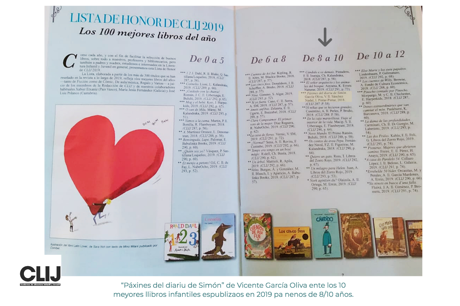 Cada añu la prestixosa revista de lliteratura infantil CLIJ presenta la so Llista d’Honor coles mires de facilitar la selección de bonos llibros, sobremanera a profesores y bibliotecarios, pero tamién a padres y madres, estudiosos ya interesaos na lliteratura infantil y xuvenil polo xeneral. Esta llista, ellaborada a partir de los casi 300 títulos que se reseñaron na revista a lo llargo de 2019, quier reflexar los 100 meyores llibros del añu, agrupaos por edaes, por tantu de ficción como de conocencies, cómic, regalu y ensayu, a xuiciu de los miembros de la redacción de CLIJ y de los sos collaboradores habituales.