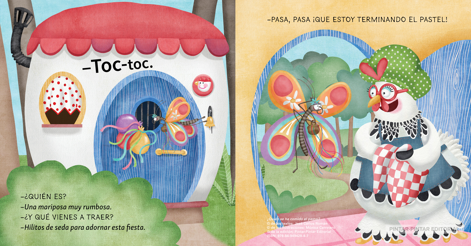 El El álbum infantil ¿Quién se ha comido el pastel?, escrito por José Carlos Román e ilustrado por Mónica Carretero, cuenta la historia de una hacendosa gallina, la Gallina Josefina, que hornea un postre en la cocina para celebrar su cumpleaños con sus animales amigos. Pero, cuando llega el momento de meter el pico o abrir el hocico, resulta que el pastel ¡ha desaparecido! (El postre no tenía patas, ¿quién se lo habrá comido?).
