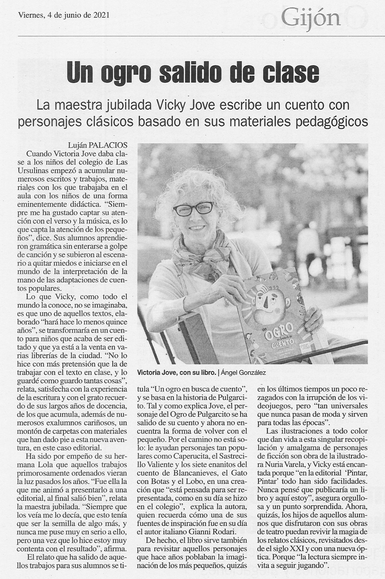 El pasado viernes 4 de junio, el diario La Nueva España publicó un artículo con motivo de nuestra reciente publicación Un ogro en busca de cuento con textos de Victoria Jove Crespo e ilustraciones de Laura Varela (Artículo: Luján Palacios / Foto: Ángel González).