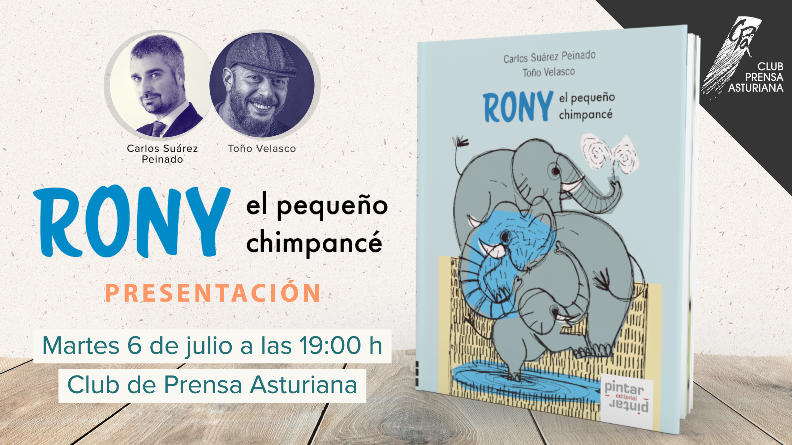 El martes 6 de julio a las 19.00 horas estaremos con Carlos Suárez Peinado y Toño Velasco en el Club de Prensa Asturiana presentando «Rony el pequeño chimpancé» – ENTRADA LIBRE HASTA COMPLETAR EL AFORO