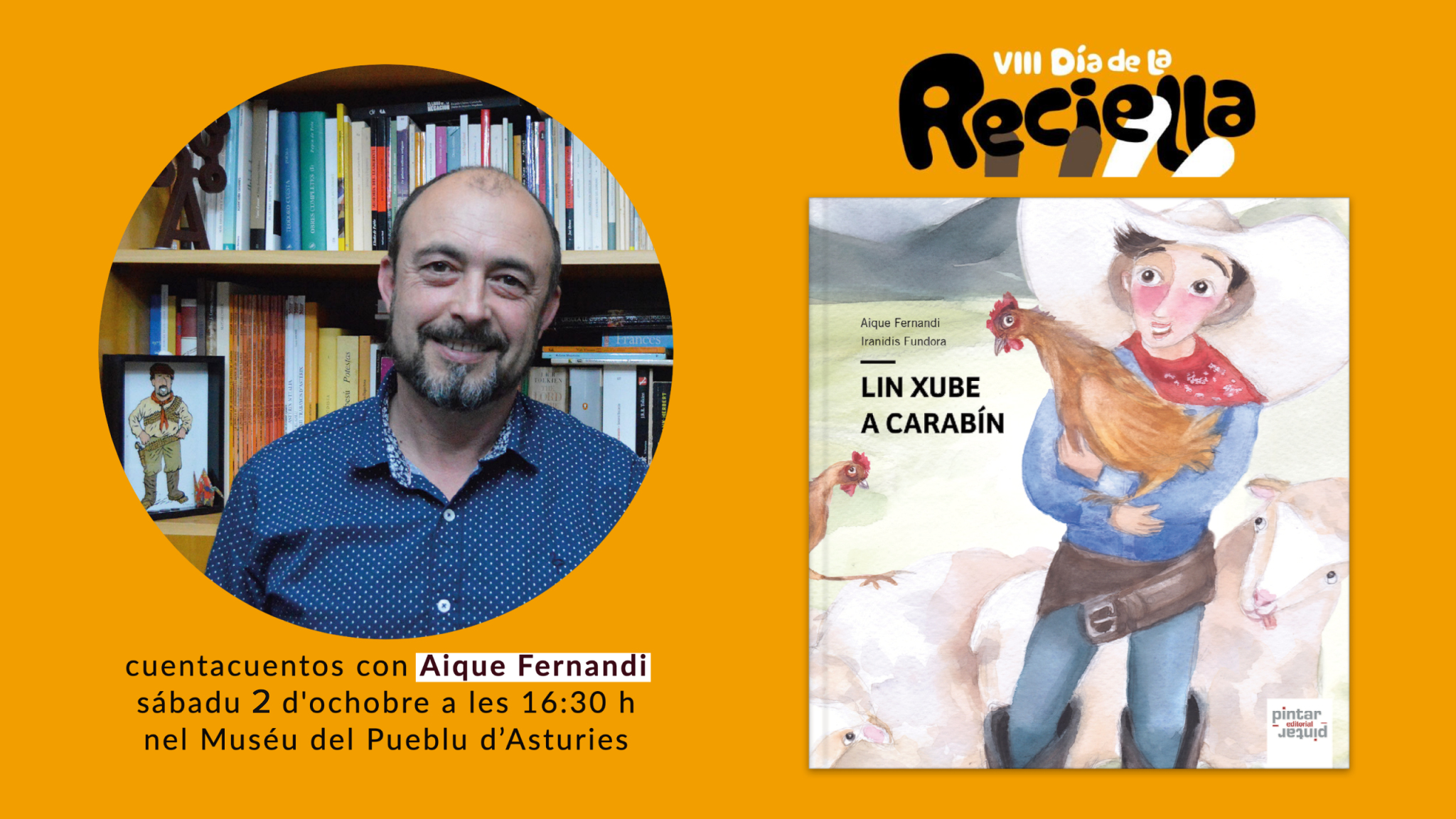 El próximu sábadu 2 d’ochobre (pela tarde) vamos tar colos nuesos llibros infantiles n’asturianu nel Muséu del Pueblu d’Asturies de Xixón celebrando el VIII Día de la Reciella 2021 que organiza l’asociación d’igual nome (Reciella). ¡Y vamos llevar en PRIMICIA MUNDIAL l’álbum ilustráu Lin xube a Carabín con testos de Aique Fernandi ya ilustraciones d’Iranidis Fundora!