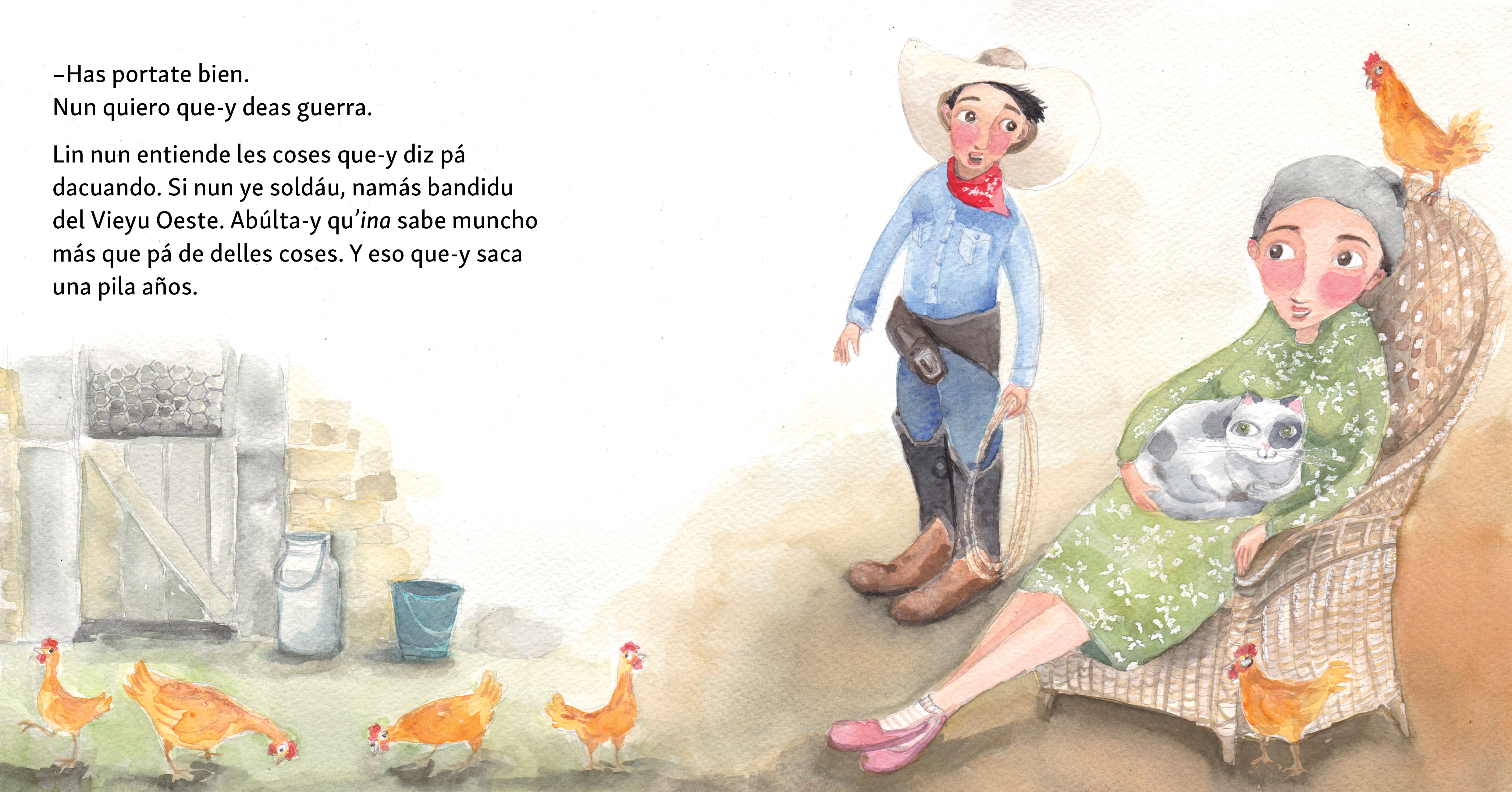 En ca güelina hai de too, una tarta nel fornu —qu’entá tien qu’esperar—, madreñes, cacía, un gatu buxu y clares de güevu que naide pue tocar. Afuera, un prau con horru, y oveyes y pites tanto o más revolvines que Lin. El neñu, antroxáu d’abixéu, escuerreles hasta qu’aporta güelina, sheriff del pueblu.
