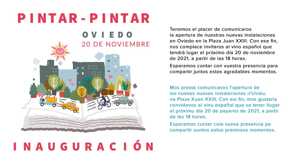 La editorial Pintar-Pintar abrirá’l so nuevu espaciu nel corazón d’Uviéu, el sábadu 20 de payares, y dará abellugu a publicaciones propies y del restu de sellos integraos nel Gremiu d’Editores d’Asturies / Gremio de Editores de Asturias. El llocal, asitiáu na plaza Xuan XXIII, a dos minutos de la catedral y del Muséu de Belles Artes, contará con espaciu enforma p’agospiar presentaciones, cuentacuentos o talleres, amás d’artículos con diseños de diferentes ilustradores.