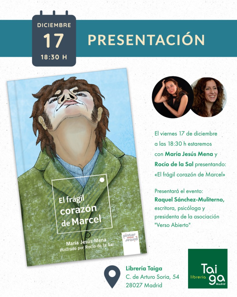 El viernes 17 de diciembre a las 18:30 h María Jesús Mena y Rocío de la Sal presentarán en la librería Taiga (Madrid) El frágil corazón de Marcel. Las acompañará en el acto la escritora, psicóloga y presidenta de la asociación «Verso Abierto», Raquel Sánchez-Muliterno.