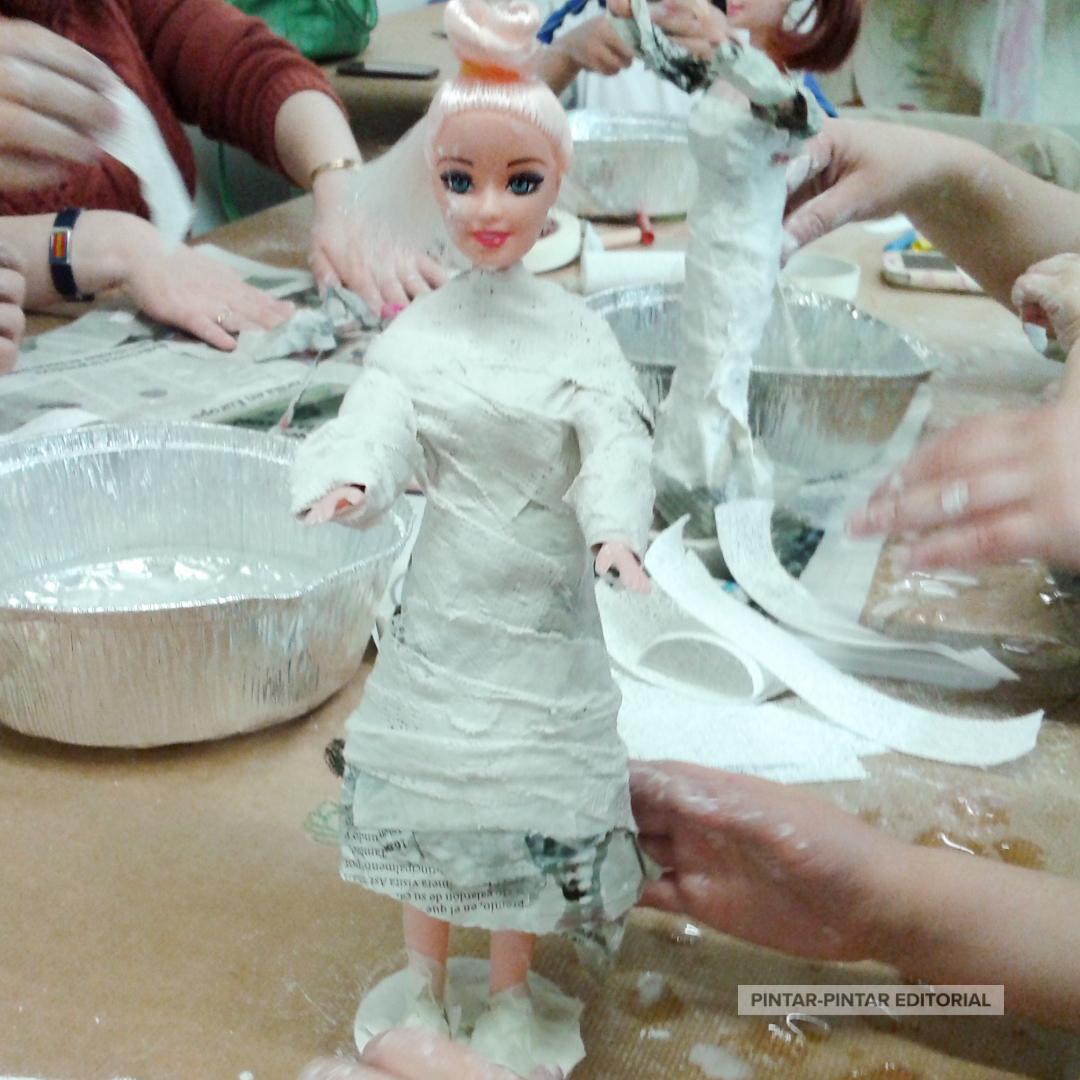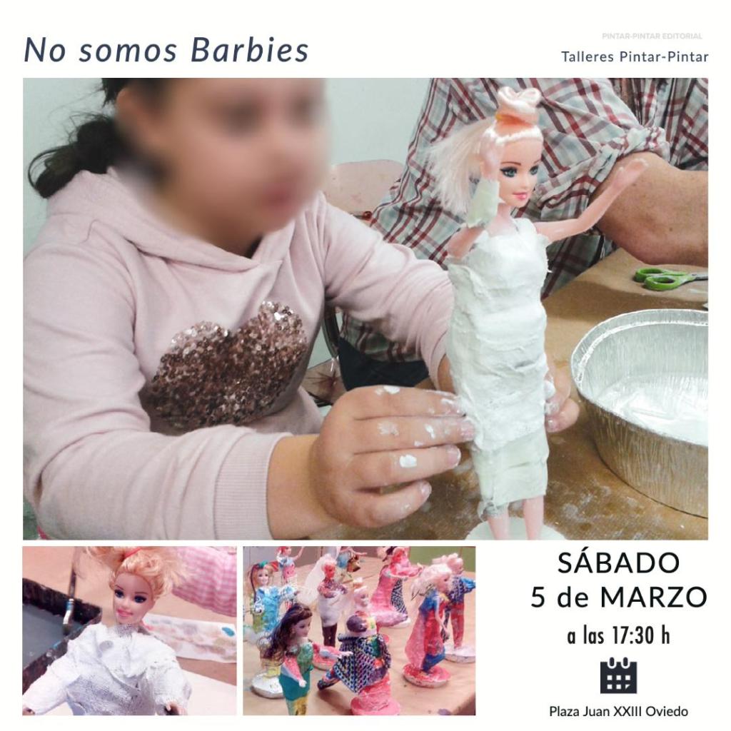 No somos Barbies: customizando ideales de Belleza. Abordaremos los roles y estereotipos presentes en nuestra sociedad. Un taller especial para acabar con los roles y estereotipos femeninos presentes en nuestra sociedad customizando muñecas tipo «Barbie». Cada participante recibirá una muñeca tipo «Barbie» que podrá customizar empleando para ello diferentes materiales y técnicas (papeles, telas, vendas de yeso, pinturas, etc.). Con ellos trataremos de modificar, a nuestro gusto, sus proporciones (irreales), ropajes y peinados, desafiando los cánones de belleza preestablecidos y dando visibilidad a muchos más y variados tipos de físicos.