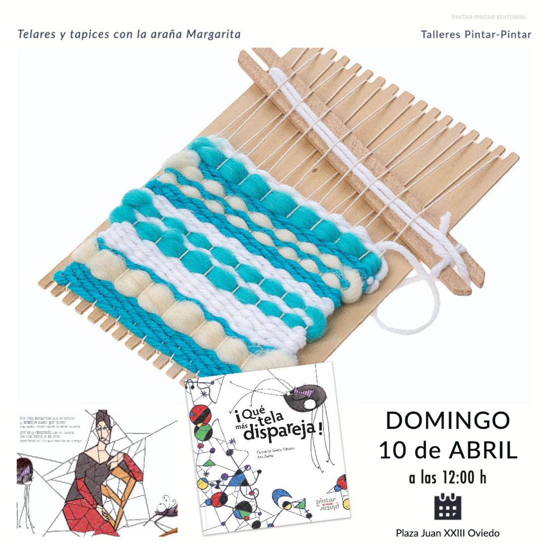 La araña Margarita sabe mover sus ocho patas sin darse a sí misma un traspiés. Sabe cantar, bailar la danza del cisne y leer de corrido, pero en lo que sí es un fracaso, un verdadero y lamentable fracaso, es a la hora de tejer. Tras la lectura del álbum infantil ilustrado «¡Qué tela más dispareja!» de Geovanys García Vistorte y Ana Zurita, nos pondremos nosotros mismos, como la araña Margarita, ¡a tejer sobre nuestro propio telar! Cada participante recibirá un telar (que podrá llevarse al finalizar el taller a su casa) sobre el que os enseñaremos a tejer con sencillos puntos, atravesando las lanas de colores a través de la urdimbre. También sacaremos nuestras pinturas y pinceles para pintar insectos como arañas, mariposas, mariquitas…