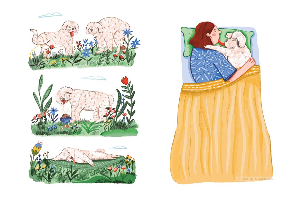 «La primera vez que leí el texto de Juan José me hizo sacar una sonrisa: tengo a mi perrita desde hace 13 años y me siento muy identificada», explica Ortiz, cuya segundo trabajo con la editorial es también su segunda colaboración en un libro. «Lo encaré con más profesionalidad, al fin y al cabo ya estaba curtida del primero. Esa profesionalidad está hilada directamente con la seguridad. En cuanto me llegó el libro y leí que hablaba del mundo de los perros, me pareció incluso que estaba escrito por mí. El hecho de haber ilustrado un libro a nivel profesional es un gran cambio, tu portfolio es más amplio y el hecho de tener varias ilustraciones con unas mismas características y siguiendo un hilo conductor, en este caso el texto, hace que te enfrentes a nuevos retos y adquieras nuevas habilidades».