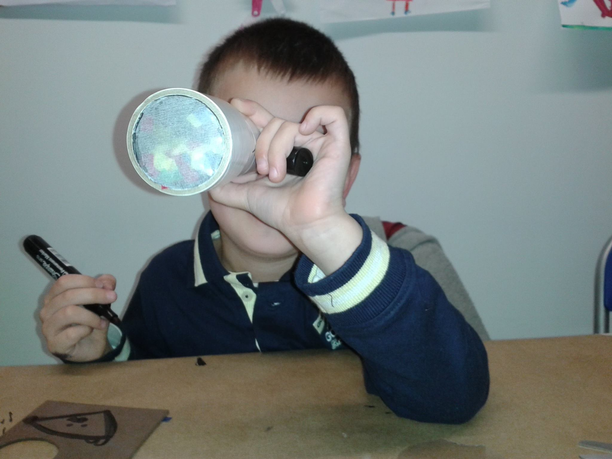 Sumérgete en el mundo mágico de 100.000 reflejos. Girando el caleidoscopio, se obtienen motivos multicolores que cambian constantemente. Podremos abrir el contenedor y cambiar a voluntad el contenido de nuestro caleidoscopio, pudiendo observar todo tipo de elementos, como papeles translúcidos de color, trocitos de plástico, etc.