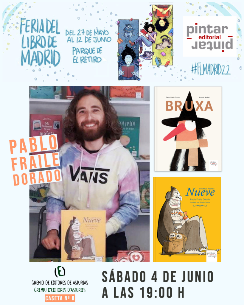Del 27 de mayo al 12 de junio podrás encontrar en la caseta nº 8 de la Feria del Libro de Madrid, una buena selección de las publicaciones pertenecientes a los sellos integrantes del Gremio de Editores de Asturias – Gremiu d’Editores d’Asturies, entre ellas nuestros álbumes infantiles ilustrados. Además podrás contar con la firma de los siguientes autores Pintar-Pintar: