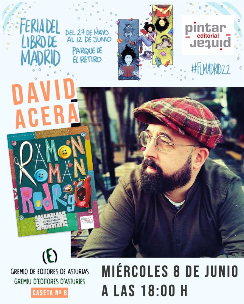 El MIÉRCOLES 8 de junio a las 18:00 h, el escritor y narrador oral David Acera, estará firmando ejemplares de «RAmón ROmán ROdrigo» en la caseta nº 8 del Gremio de Editores de Asturias / Gremiu d’Editores d’Asturies