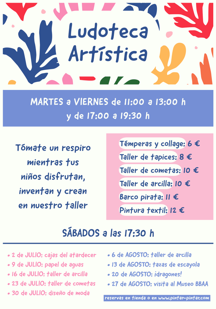 Ludoteca artística Pintar-Pintar. Tómate un respiro mientras tus niños disfrutan, inventan y crean en nuestro taller. Pondremos a su disposición pinturas, pinceles, colores, papeles y diferentes materiales para crear. Más información.