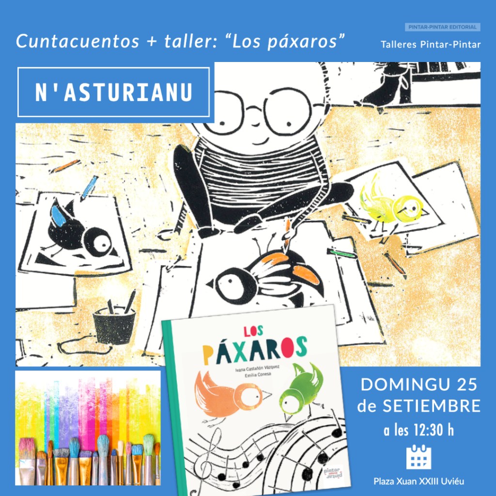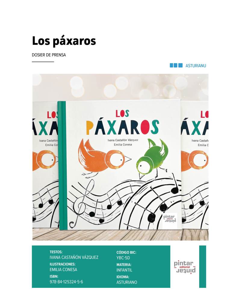 Escritu por Ivana Castañón Vázquez y ilustráu por Emilia Conesa, Los páxaros avérase a les nuestres aficiones dende una perspeutiva llúdica y fresca, ensin l’utilitarismu con que, davezu, s’envuelve aquello que más nos presta, quitándonos l’allegría puro del simple fechu de facelo.
