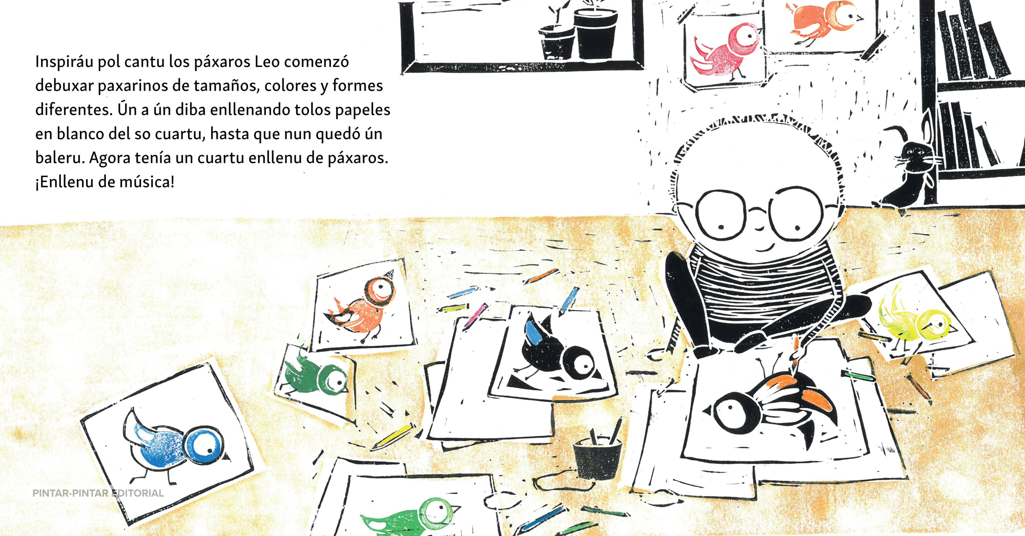 Asina foi surdiendo esti llibru enllenu de color y de notes musicales, soníos qu’al iniciu esnalen como páxaros y llueu van cayendo como fueyes, pa terminar volando otra vuelta nuna sola melodía. Un mou d’esnalar que s’estiende a l’axuntanza ente’l testu d’Ivana y les ilustraciones d’Emilia, conectaes por un filu perfinu y doráu qu’orienta a Leo nos momentos malos y bonos.