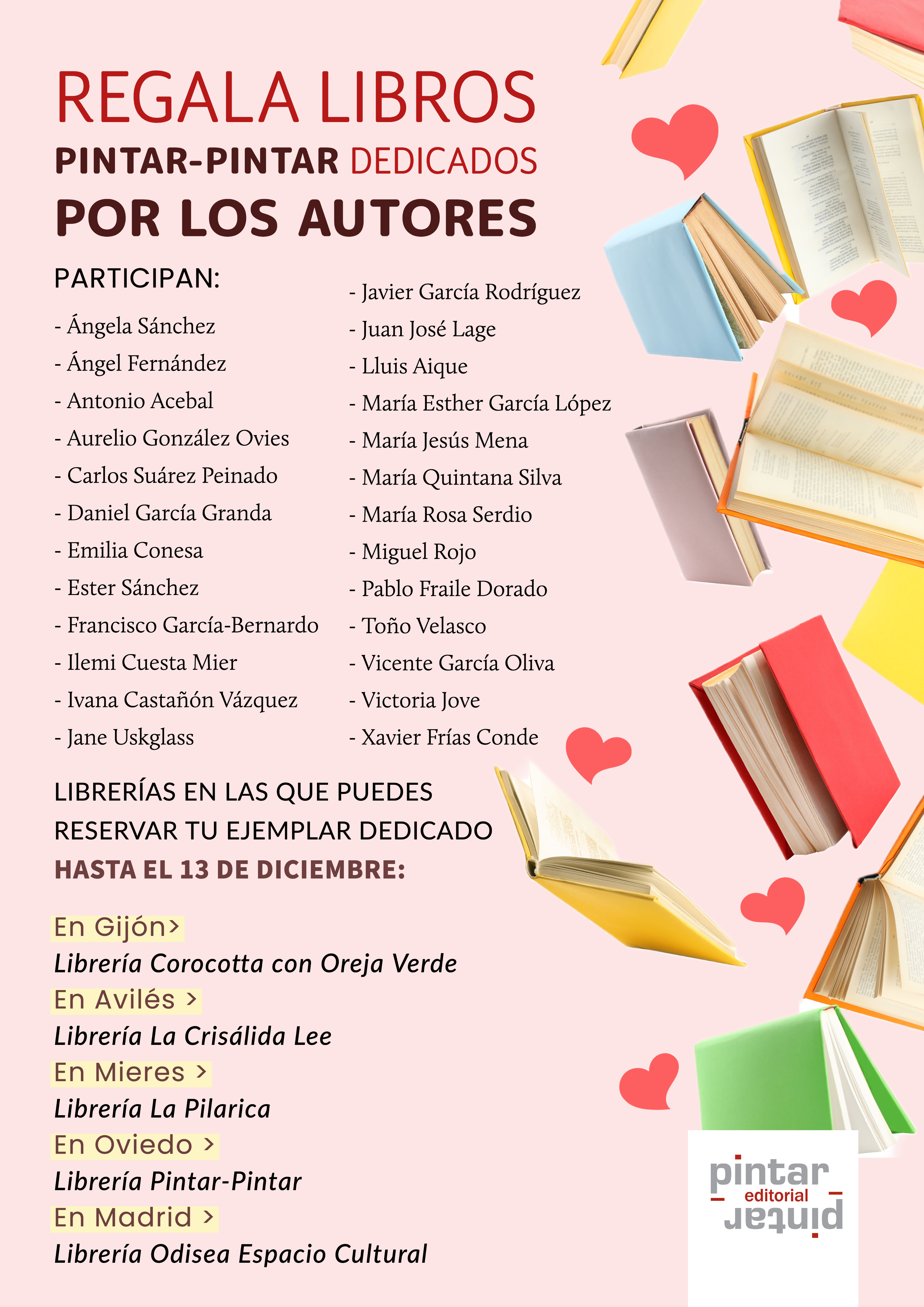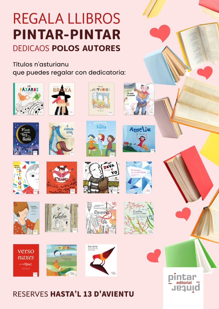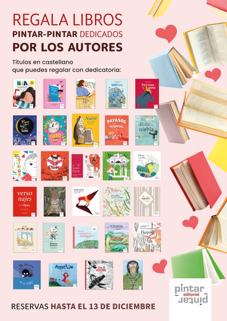 Desde Pintar-Pintar y en colaboración con nuestro distribuidor, Asturlibros, y las librerías La Crisálida Lee (Avilés), Corocotta con Oreja Verde (Gijón), La Pilarica (Mieres), Odisea Espacio Cultural (Madrid) y Pintar-Pintar, Libros, colores y Lletres Asturianes (Oviedo), ponemos en marcha una promoción especial para estas Navidades: regala libros Pintar-Pintar dedicados por los autores, por tu autor o autora favorito.