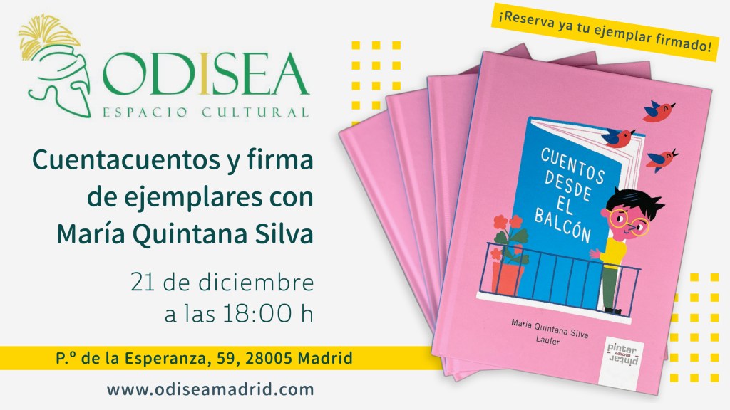 Si vives en Madrid y te apetece conocer a María Quintana Silva y asistir a una sesión de cuentacuentos con ella, anota esta fecha: 21 de diciembre a las 18:00 h porque estará firmando ejemplares y contando «Cuentos desde el balcón» en la Librería Odisea Espacio Cultural