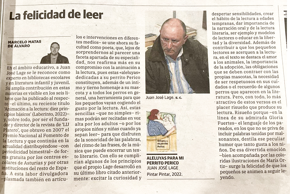 En el ámbito educativo, a Juan José Lage se le reconoce como experto en bibliotecas escolares y en literatura infantil y juvenil. Su amplia contribución en estas materias es visible en los seis libros que ha publicado al respecto -el último, su reciente título «Animacióna la lectura: diez principios básicos’» (Laberinto, 2022) y, sobre todo, por ser el fundador y director de la revista de ‘LIJ Platrero’, que obtuvo en 2007 el Premio Nacional al Fomento de la Lectura y que continúa en la actualidad distribuyéndose -con periodicidad bimestral- de forma gratuita por los centros escolares de Asturias y por otras instituciones del resto de España. A esta labor divulgadora -plasmada también en artículos e intervenciones en diferentes medios- se une ahora su facultad como poeta, que, lejos de sorprendernos al parecer una faceta apartada de su especialidad, nos reafirma más en su compromiso con la animación a la lectura, pues estas «aleluyas» dedicadas a su perrito Perico constituyen, además de un íntimo y tierno homenaje a su mascota y a todos los perros en general, una herramienta para que los pequeños vayan cogiendo el gusto por la lectura. Así, estas sencillas -que no simples- rimas podrán ser recitadas en voz alta por los adultos -o por los propios niños y niñas cuando ya sepan leer- para que disfruten de la sonoridad de las palabras, del ritmo de las frases, de la música que puede encerrar un texto literario. Con ello se cumplirían algunos de los principios que el propio Lage desarrolló en su último libro citado anteriormente: excitar la curiosidad y despertar sensibilidades, crear el hábito de la lectura a edades tempranas, dar importancia de la narración oral y de la lectura literaria, ser ejemplo y modelos de lectores o educar en la libertad y la diversidad. Además de contribuir a que los pequeños lectores se acerquen a la lectura, en el texto se destaca el amor a los animales, la importancia de la adopción, las obligaciones que se deben contraer con las propias mascotas, la necesidad de ser respetuosos en sus cuidados o el recuerdo de algunos perros que aparecen en la literatura. Pero, con todo, lo más atractivo de estos versos es el placer risueño que produce su lectura. Risueño porque -en la linea de su admirada Gloria Fuertes- el lenguaje de los pareados, en los que no se priva de incluir palabras tenidas por malsonantes, destila ese peculiar humor que tanto gusta a los niños. De esa divertida emoción -bien acompañada por las coloridas ilustraciones de María Ortiz- surge la felicidad de que los pequeños se animen a seguir leyendo.