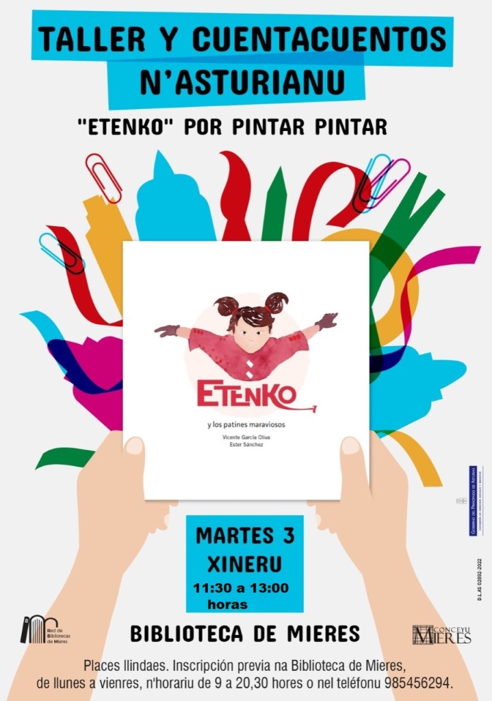 Cuntacuentos + taller n’asturianu «Etenko y los patines maraviosos«. Taller y cuntacuentos entamáu pola Conceyalía d’Educación y Normalización Llingüística. Para neños mayores de 6 años. Places llindaes. Inscripción previa na Biblioteca de Mieres, de llunes a vienres, n’horariu de 9 a 20,30 hores o nel teléfonu 985456294.