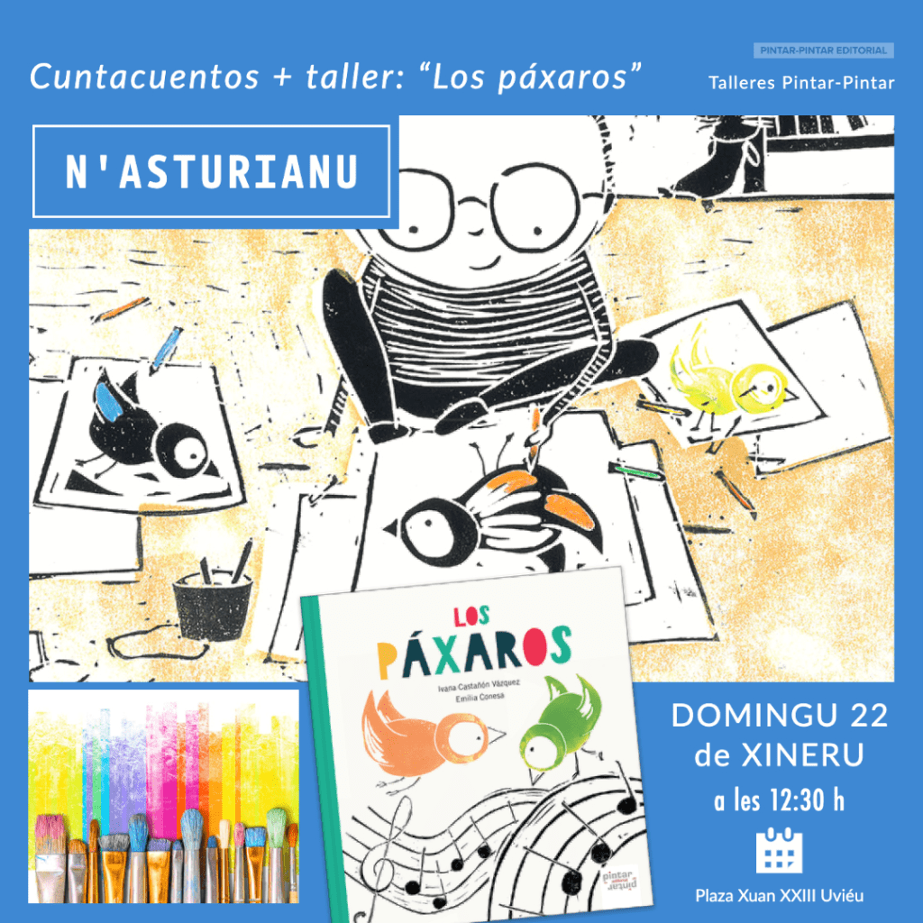 - PRECIU de la actividá: 8 € (un adultu gratis por cada entrada infantil). Materiales + un exemplar del álbum infantil ilustráu «Los páxaros» incluyíos nel preciu.