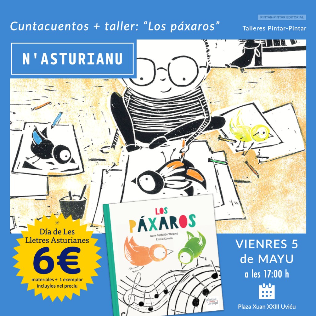 - PRECIU de la actividá: 6 € (un adultu gratis por cada entrada infantil). Materiales + un exemplar del álbum infantil ilustráu «Los páxaros» incluyíos nel preciu + regalo del llibru Xosé Bolado. Fálame duce.
