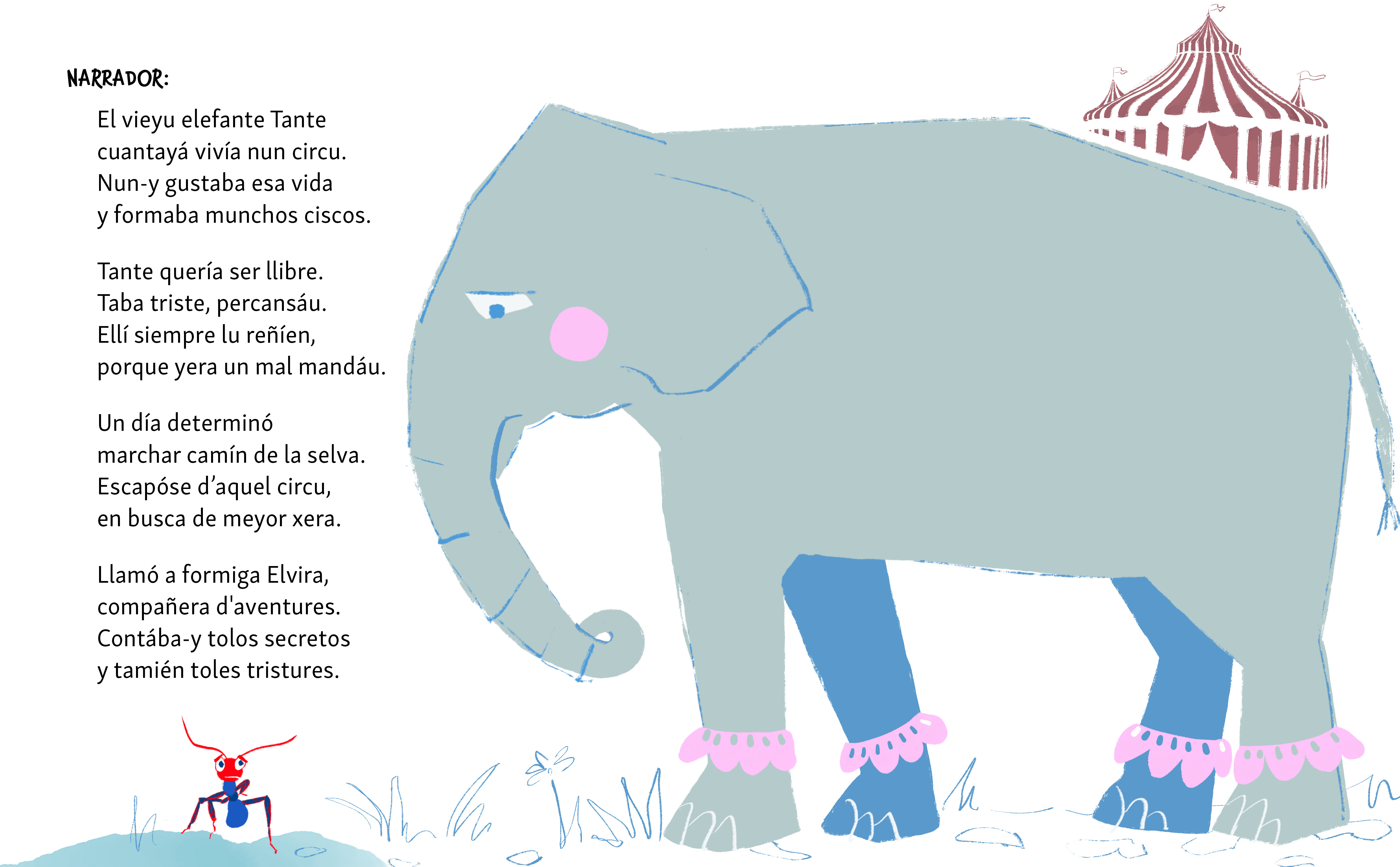 La hestoria de Tante, un elefante bonal ya inxenuu, vien cargada d’ingredientes paecíos: tenrura, ilusión, allegría y humor, y too ello mecío, diz Ester Sánchez, «va dexando posu». «Apetez da-y un achuchón al elefante, tan grandón frente a la escala en pequeñino de la so querida collacia, la formiga Elvira», añade.