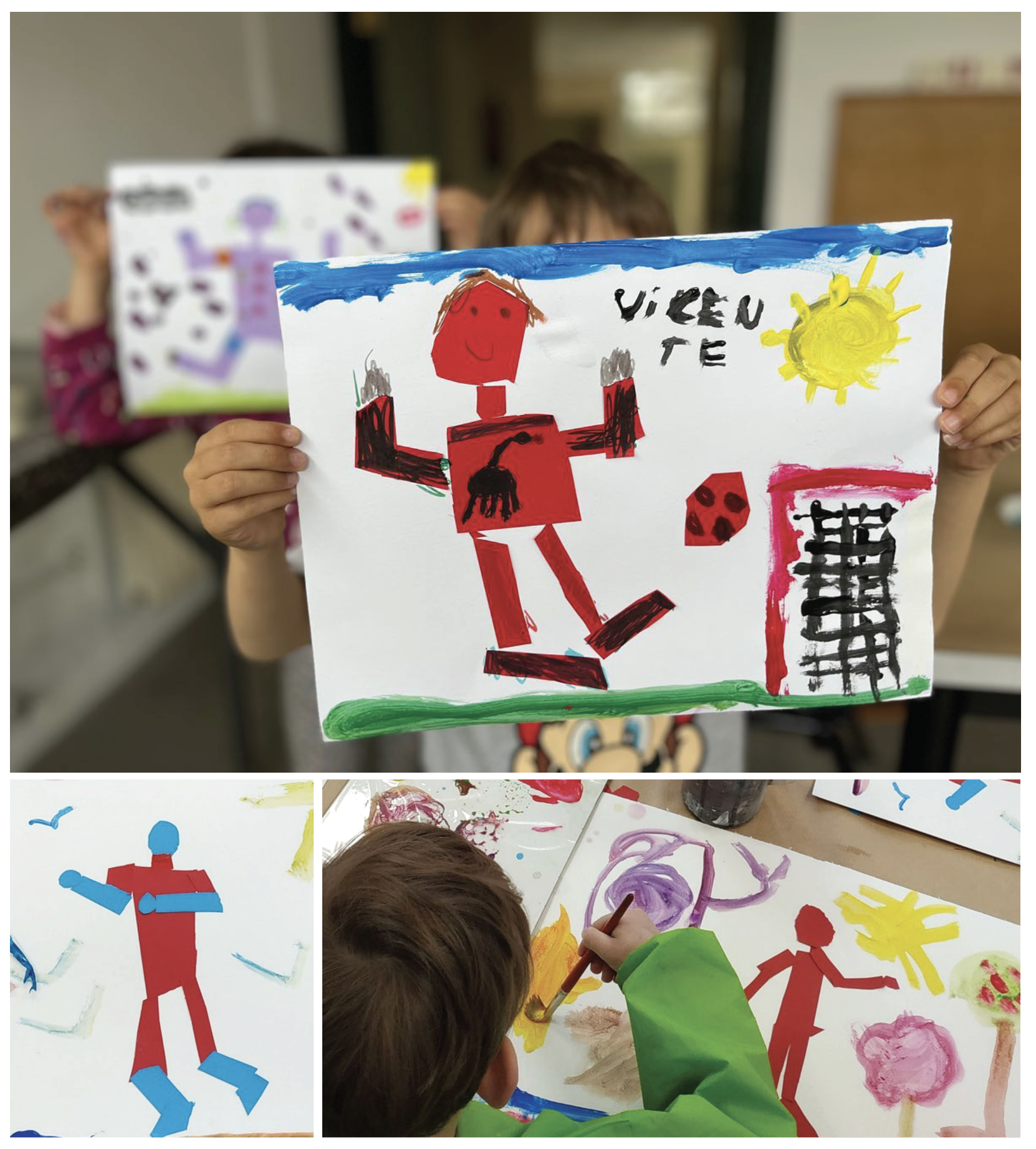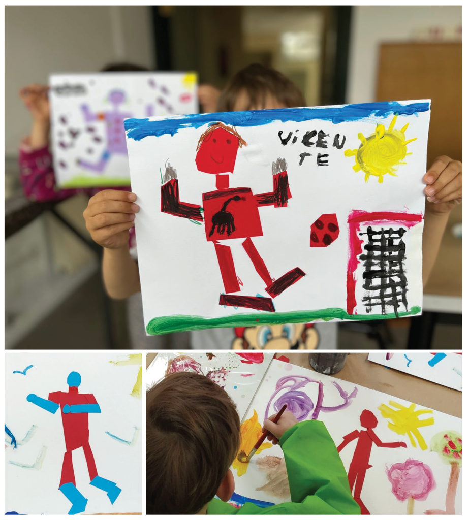 El cuento de Etenko nos brinda una oportunidad fantástica para repasar el esquema gráfico corporal. Habla de las diferentes partes del cuerpo humano, sus proporciones, articulaciones etc. Los niños y niñas cuando representan figuras humanas tienden a colocarlas en posición estática. Hoy les enseñarás lo fácil que puede ser representar una figura en movimiento, como por ejemplo una mujer deportista: jugando al fútbol, al tenis, patinando etc. Para ello emplearemos el collage como técnica. Solo necesitarás papeles de colores, tijeras, pegamento y pinturas (rotuladores, témperas, ceras etc). Lo primero de todo será recortar una cabeza, y a partir de ella colocar el cuello, hombros, tronco, brazos y piernas. Pero ¡ojo! para dar movimiento a nuestro personaje, tendréis que marcar rodillas en las piernas y codos en los brazos. ¡Ensayad primero entre vosotros la postura del cuerpo que queréis representar!