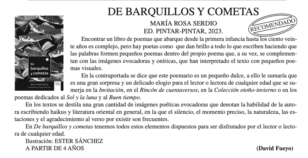 En ella podrás encontrar, entre el listado de libros recomendados, el poemario «De barquillos y cometas» de María Rosa Serdio y Ester Sánchez.