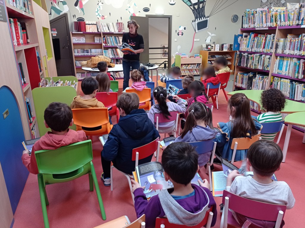 El jueves 8 de marzo visitamos a las niñas y niños de Noreña, y les llevamos la lectura del álbum ilustrado Y de repente se fue la luz… de la luna, escrito por Xavier Frías Conde e ilustrado por Laufer.