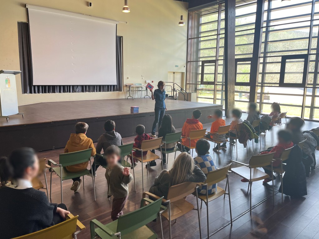 Esta mañana hemos estamos con un grupo de niñas y niños en Rusecu/Rioseco hablando de libros y leyendo el álbum ilustrado «Cuentos desde el balcón» de María Quintana Silva y Laufer.