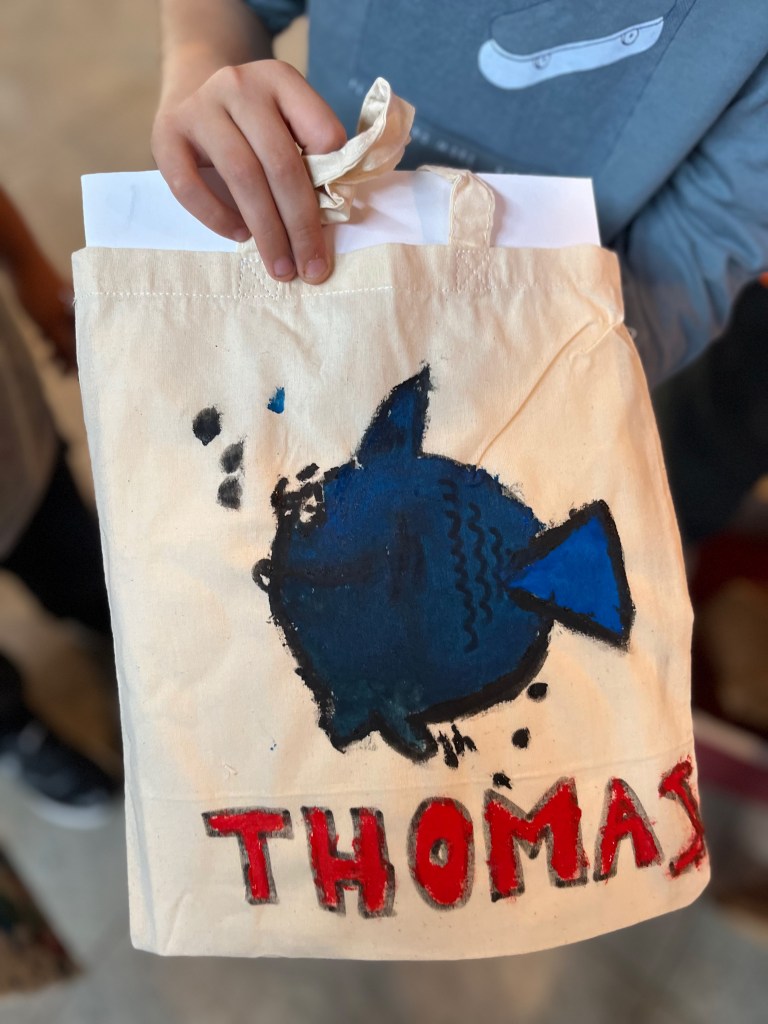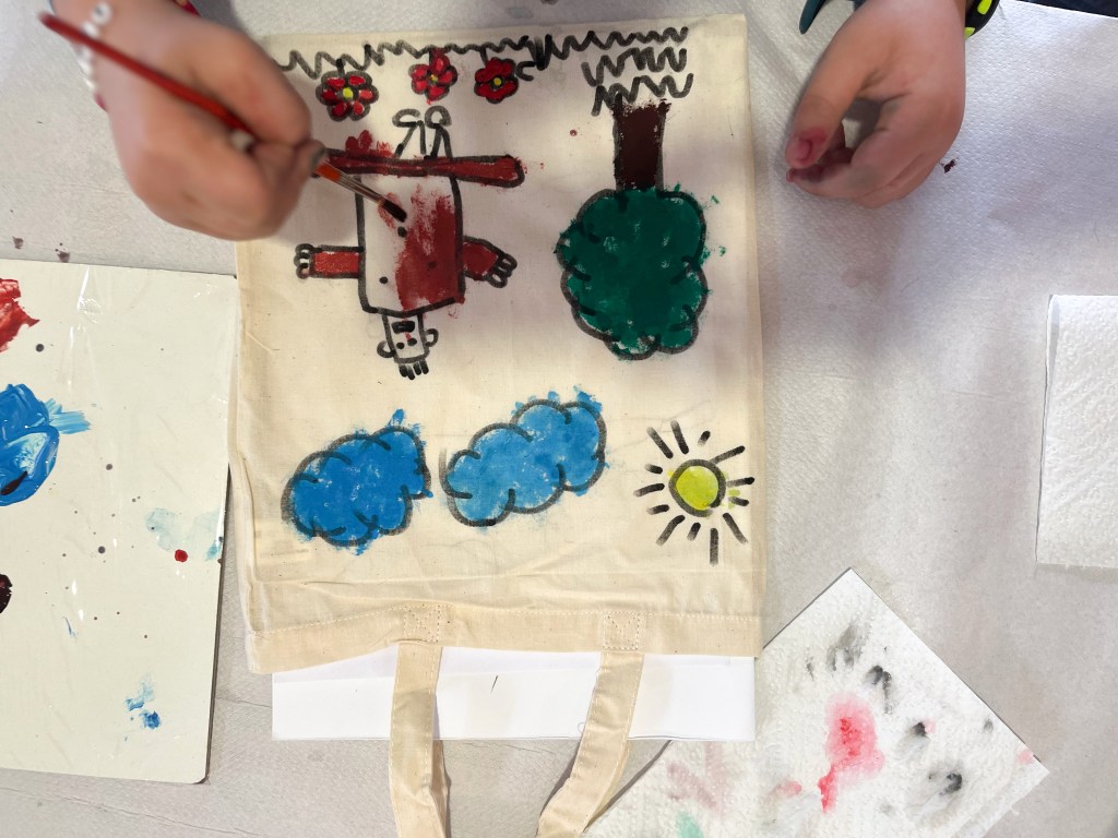 Y tras la lectura, hemos personalizado unas bolsas de algodón con nuestras ilustraciones para meter este libro y ¡un montón de cuentos más!