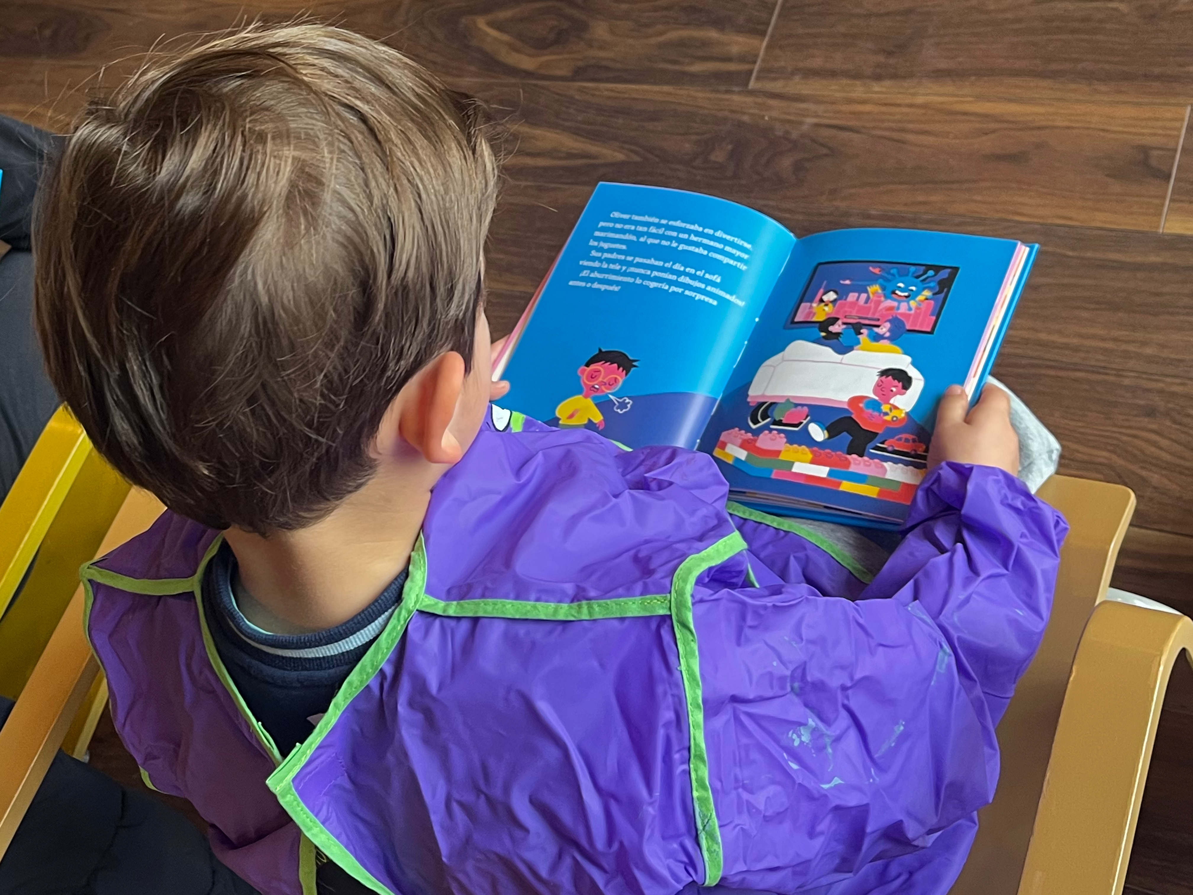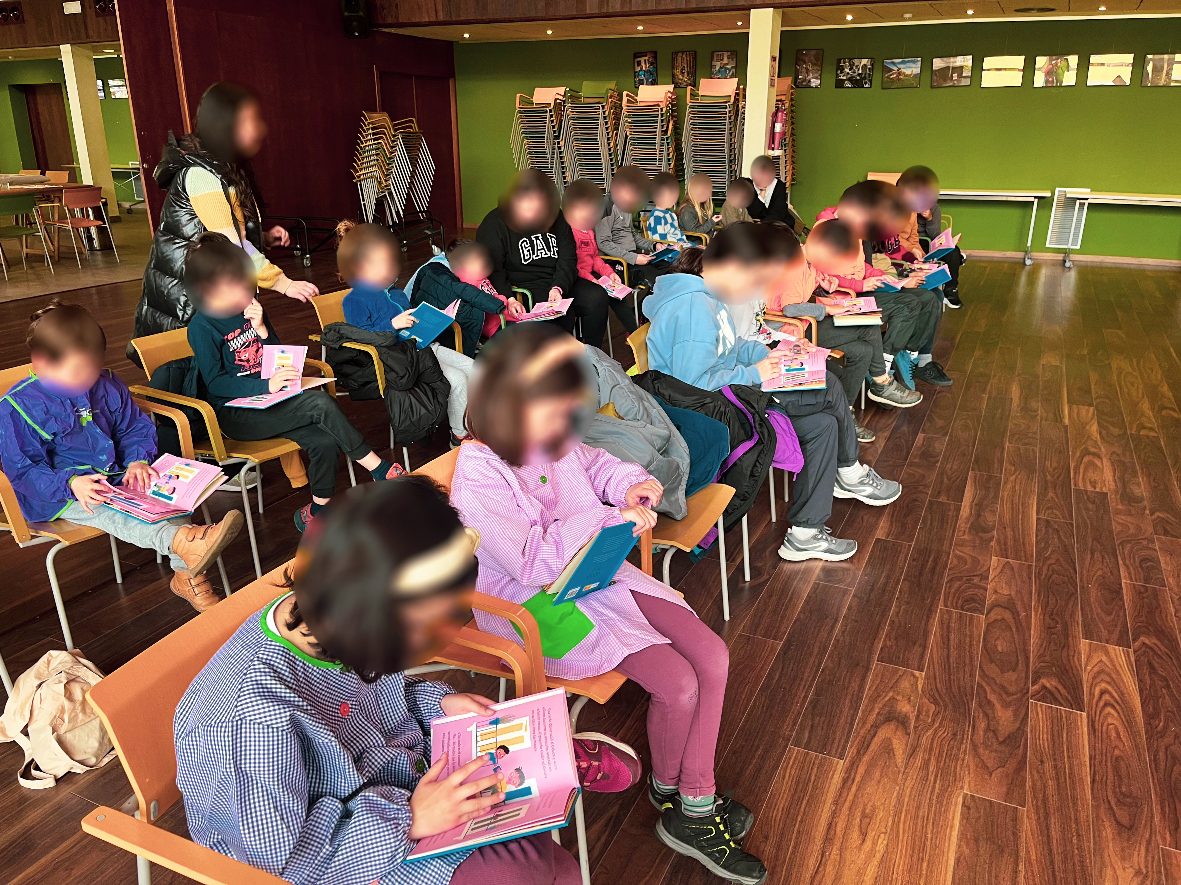 Esta mañana hemos estamos con un grupo de niñas y niños en Rusecu/Rioseco hablando de libros y leyendo el álbum ilustrado «Cuentos desde el balcón» de María Quintana Silva y Laufer.