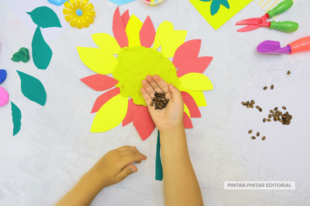 Proporciona a los niños y niñas plastilina o arcilla y pídeles que creen esculturas de semillas y flores inspiradas en las ilustraciones del libro. Pueden modelar semillas, brotes, flores y otras formas relacionadas con el ciclo de vida de las plantas, explorando texturas y detalles.