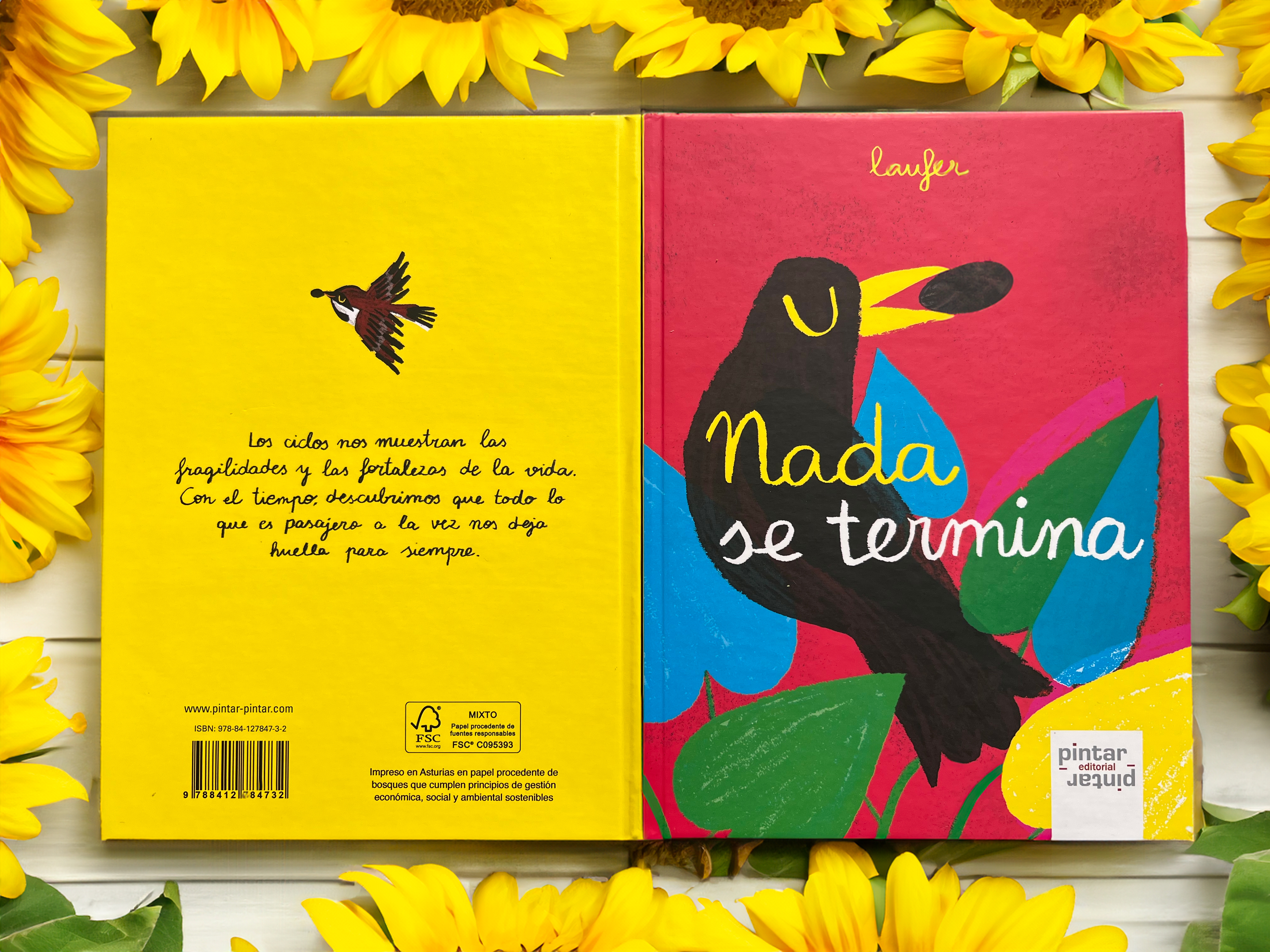 En Nada se termina Laufer (Laura Fernández Arquisola) nos habla de la vida y sus ciclos a través de la conexión entre un mirlo y un girasol, de cómo el girasol muere dejando el campo lleno de semillas, de las que luego brotarán nuevas flores, en un ciclo continuo que nos lleva a pensar sobre nuestro lugar en la naturaleza y nos iguala con otras formas de vida.
