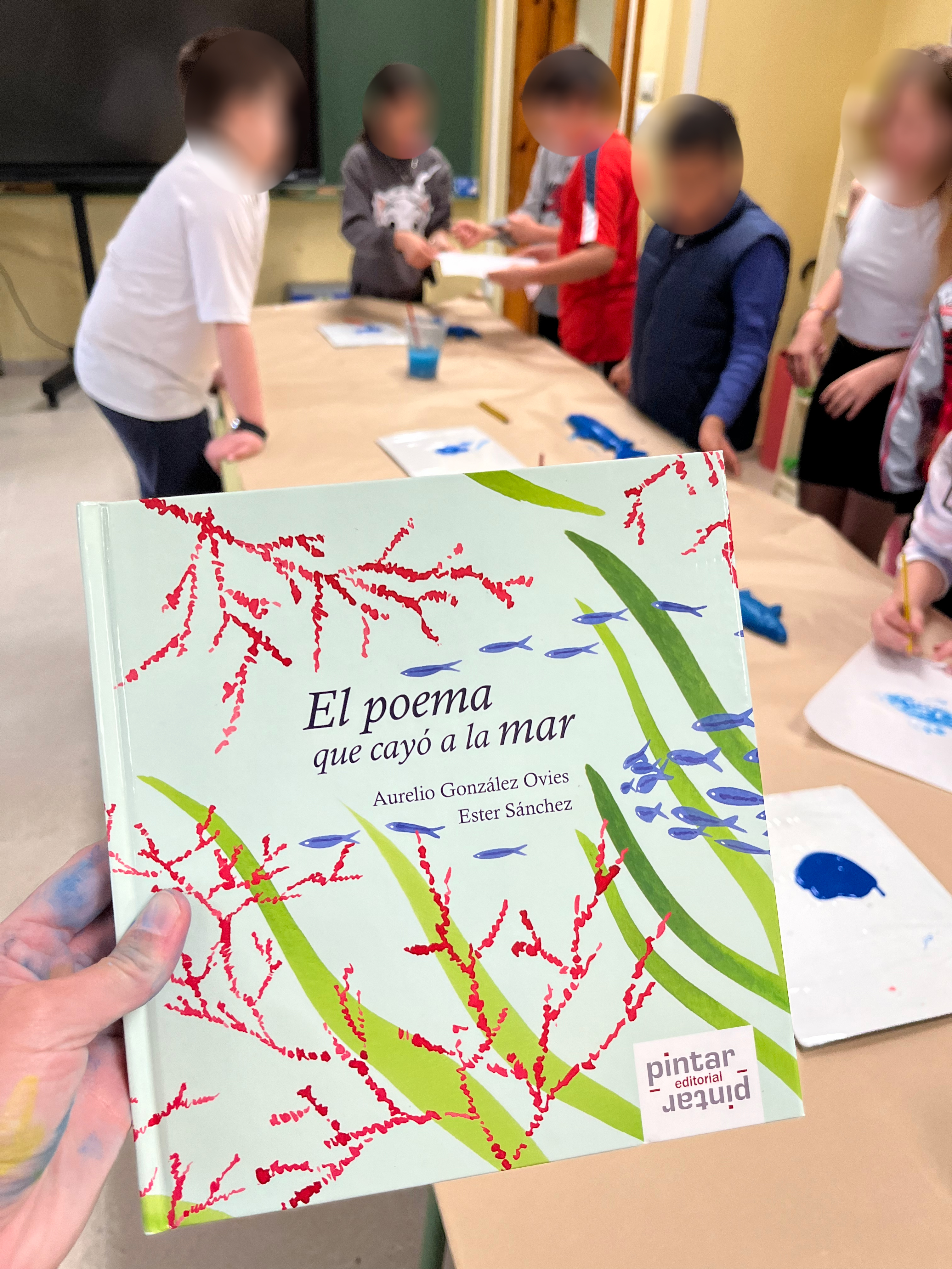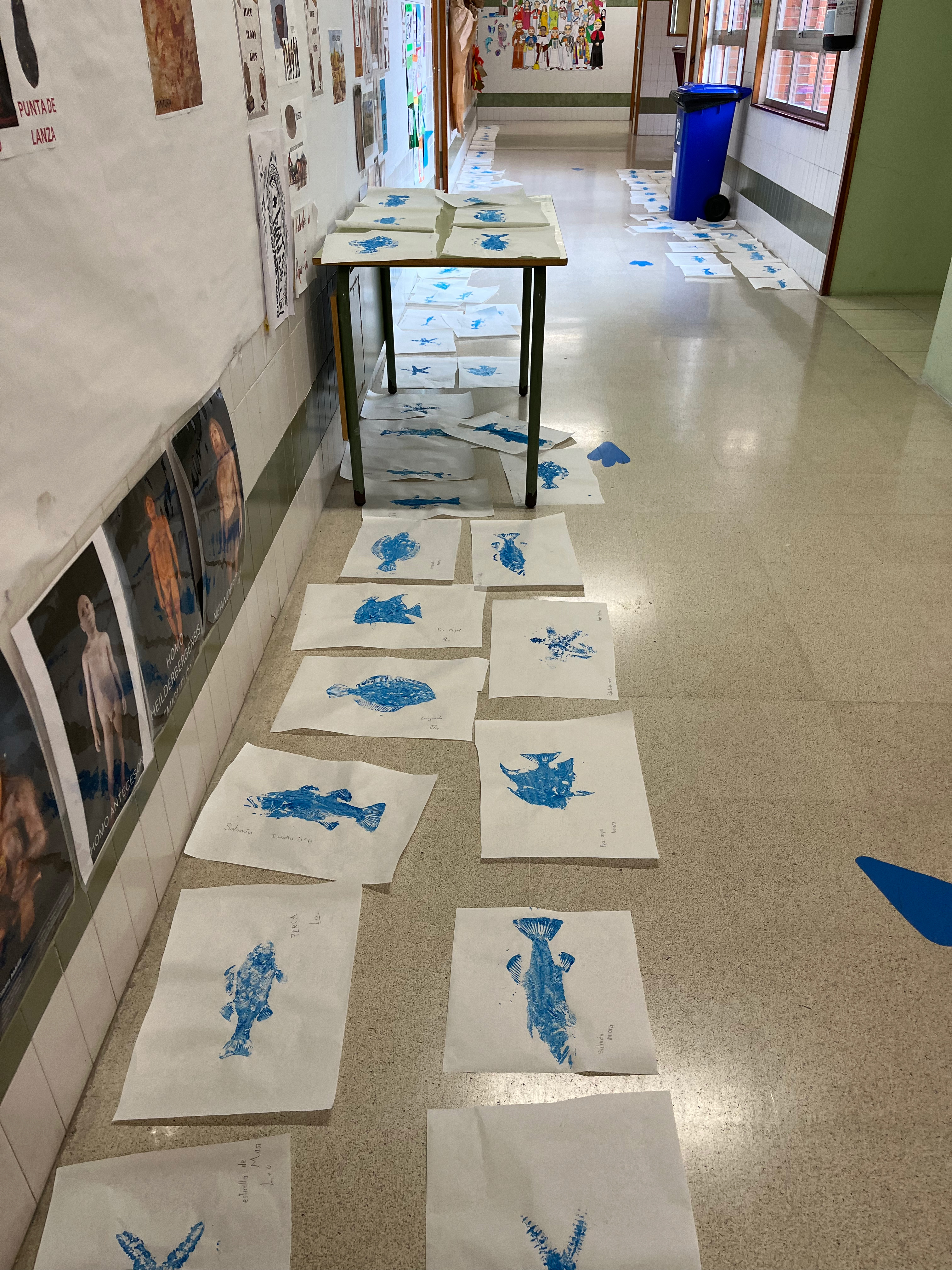 - Con las chicas y chicos de quinto de primaria leímos El poema que cayó a la mar, del poeta Aurelio González Ovies e ilustraciones de la propia Ester Sánchez. Les enseñamos la técnica del gyotaku y, como si fuera la pesca del «campanu», ¡llenamos los pasillos de peces!