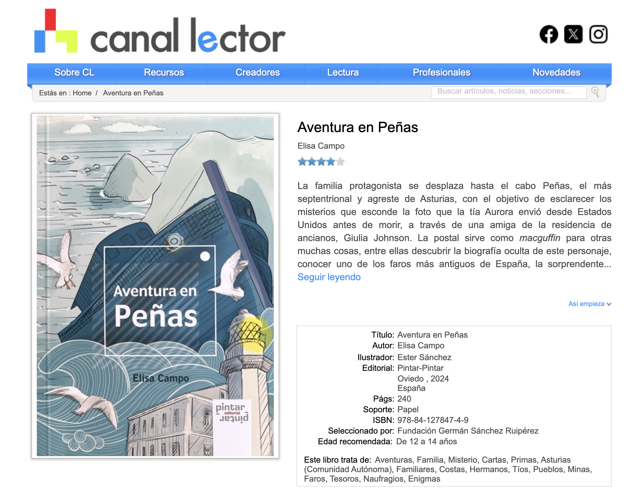 Nos alegra anunciaros que la novela juvenil «Aventura en Peñas», escrita por Elisa Campo, ha sido seleccionada como novedad destacada en la web Canal Lector de la Fundación Germán Sánchez Ruipérez, institución cultural dedicada a fomentar el interés por la lectura y contribuir al desarrollo de la educación y la cultura.