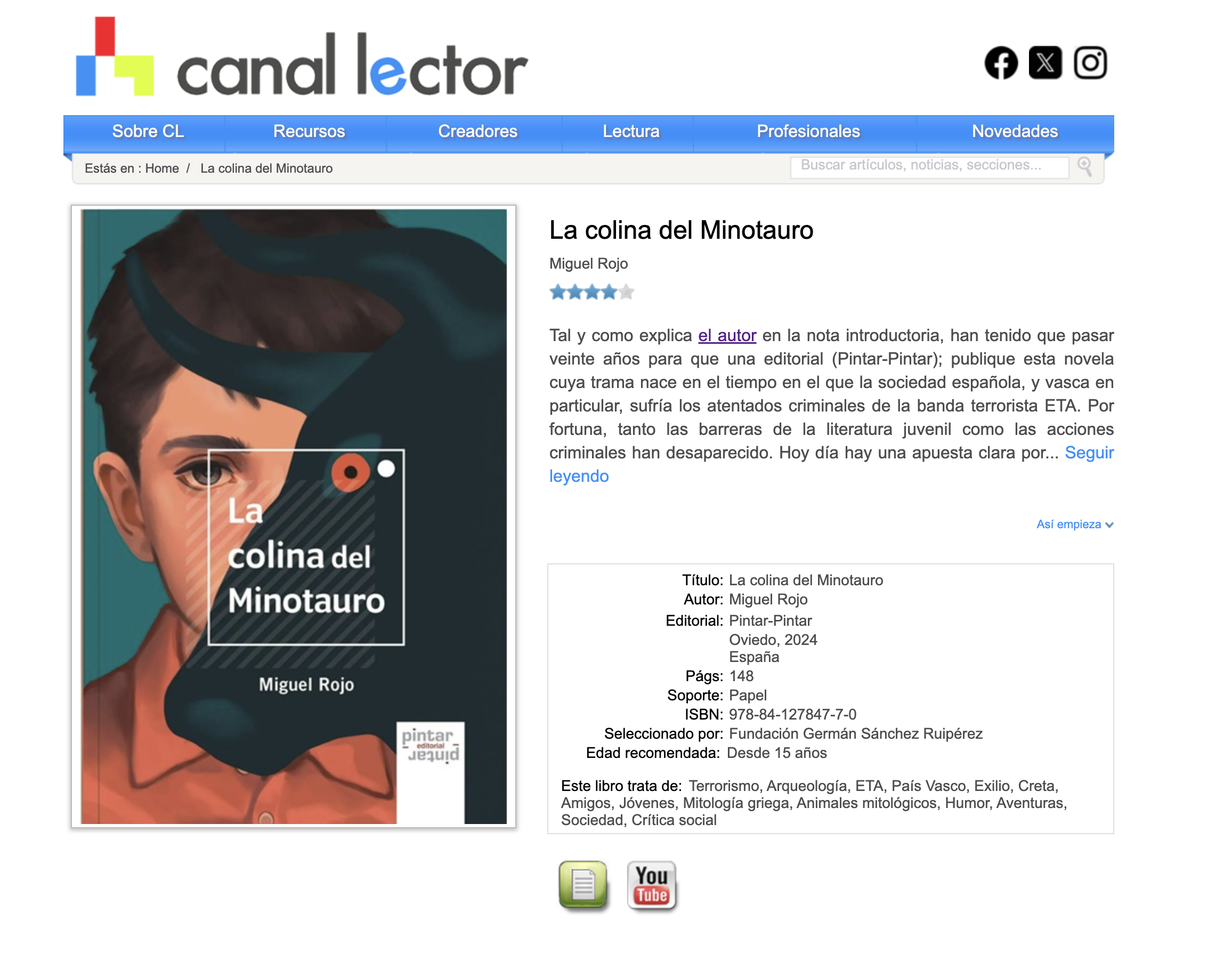 Nos alegra anunciaros que la novela juvenil «La colina del Minotauro» escrita por Miguel Rojo, ha sido seleccionada como novedad destacada en la web Canal Lector de la Fundación Germán Sánchez Ruipérez, institución cultural dedicada a fomentar el interés por la lectura y contribuir al desarrollo de la educación y la cultura.