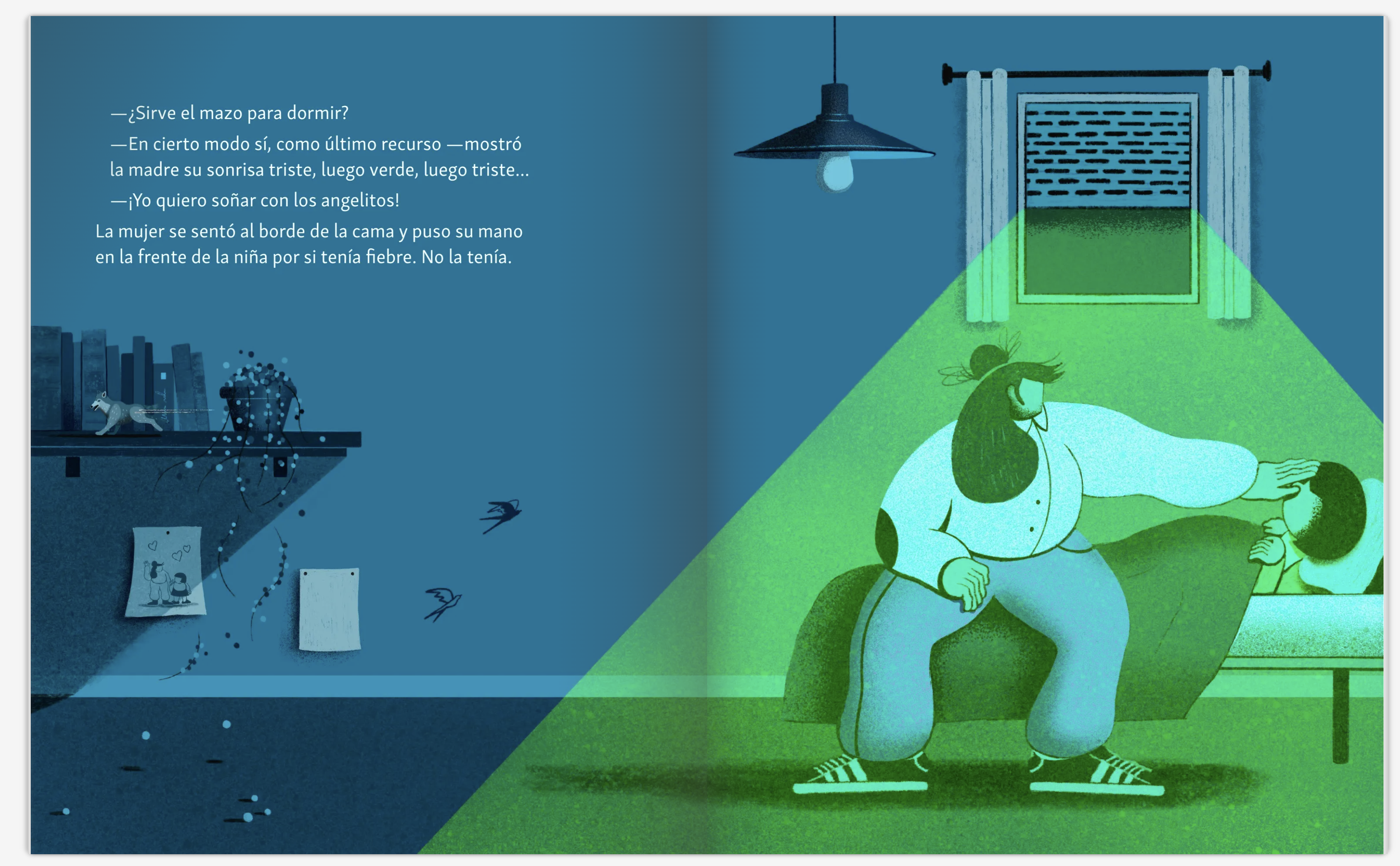El resultado, una vez leída la obra, no puede estar más ajustado a los objetivos de autor e ilustrador. El álbum, tan de actualidad como en 2009, se convierte en una experiencia sensorial que va más allá de la clásica lectura. Y todo en base a la luz intermitente de una farmacia, una habitación oscura y una madre y su hija, charlando, justo antes de dormir como tantas otras antes de ellas.