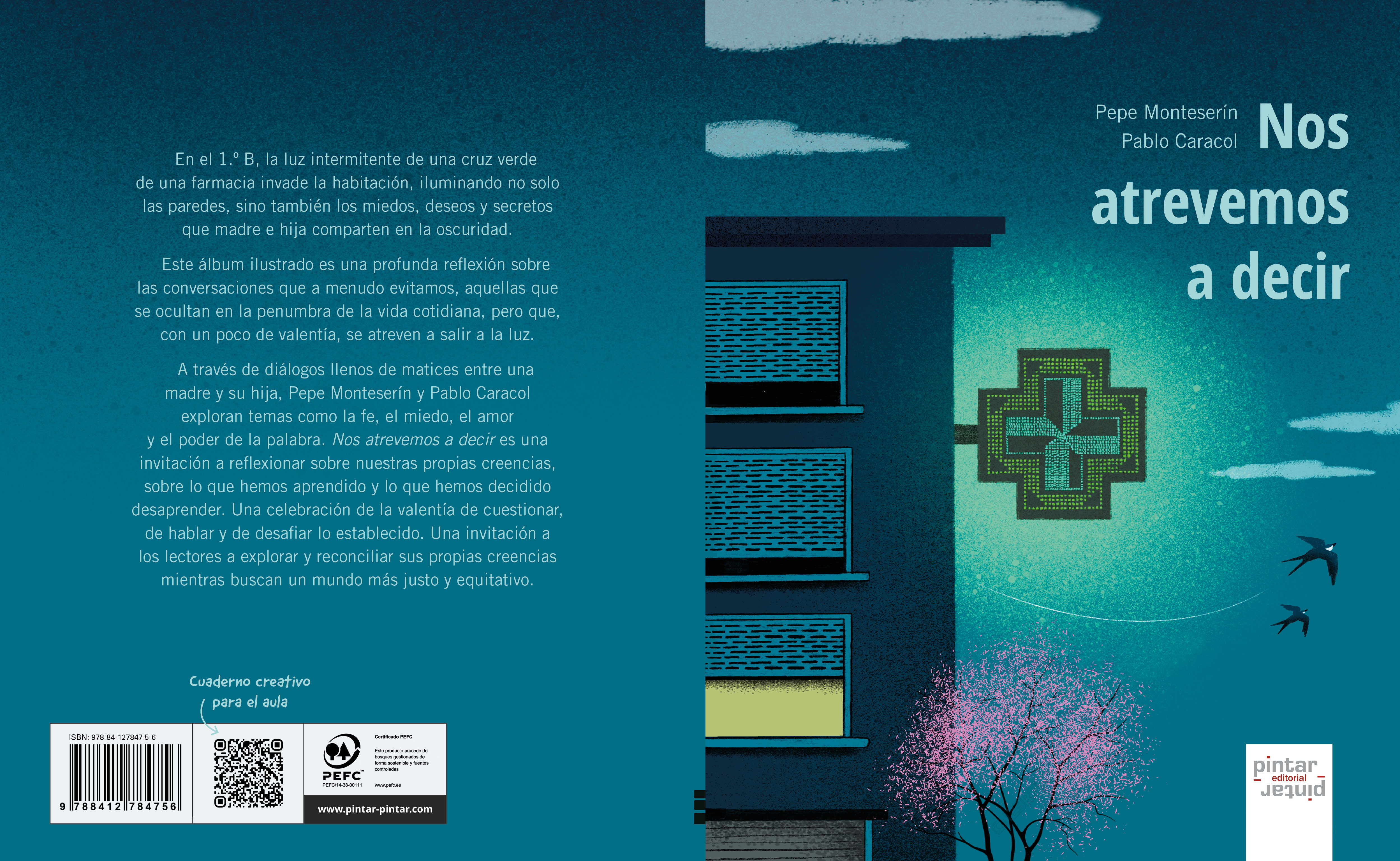 En el 1.º B, la luz intermitente de una cruz verde de una farmacia invade la habitación, iluminando no solo las paredes, sino también los miedos, deseos y secretos que madre e hija comparten en la oscuridad. Este álbum ilustrado es una profunda reflexión sobre las conversaciones que a menudo evitamos, aquellas que se ocultan en la penumbra de la vida cotidiana, pero que, con un poco de valentía, se atreven a salir a la luz. A través de diálogos llenos de matices entre una madre y su hija, Pepe Monteserín y Pablo Caracol exploran temas como la fe, el miedo, el amor y el poder de la palabra. Nos atrevemos a decir es una invitación a reflexionar sobre nuestras propias creencias, sobre lo que hemos aprendido y lo que hemos decidido desaprender. Una celebración de la valentía de cuestionar, de hablar y de desafiar lo establecido. Una invitación a los lectores a explorar y reconciliar sus propias creencias mientras buscan un mundo más justo y equitativo.
