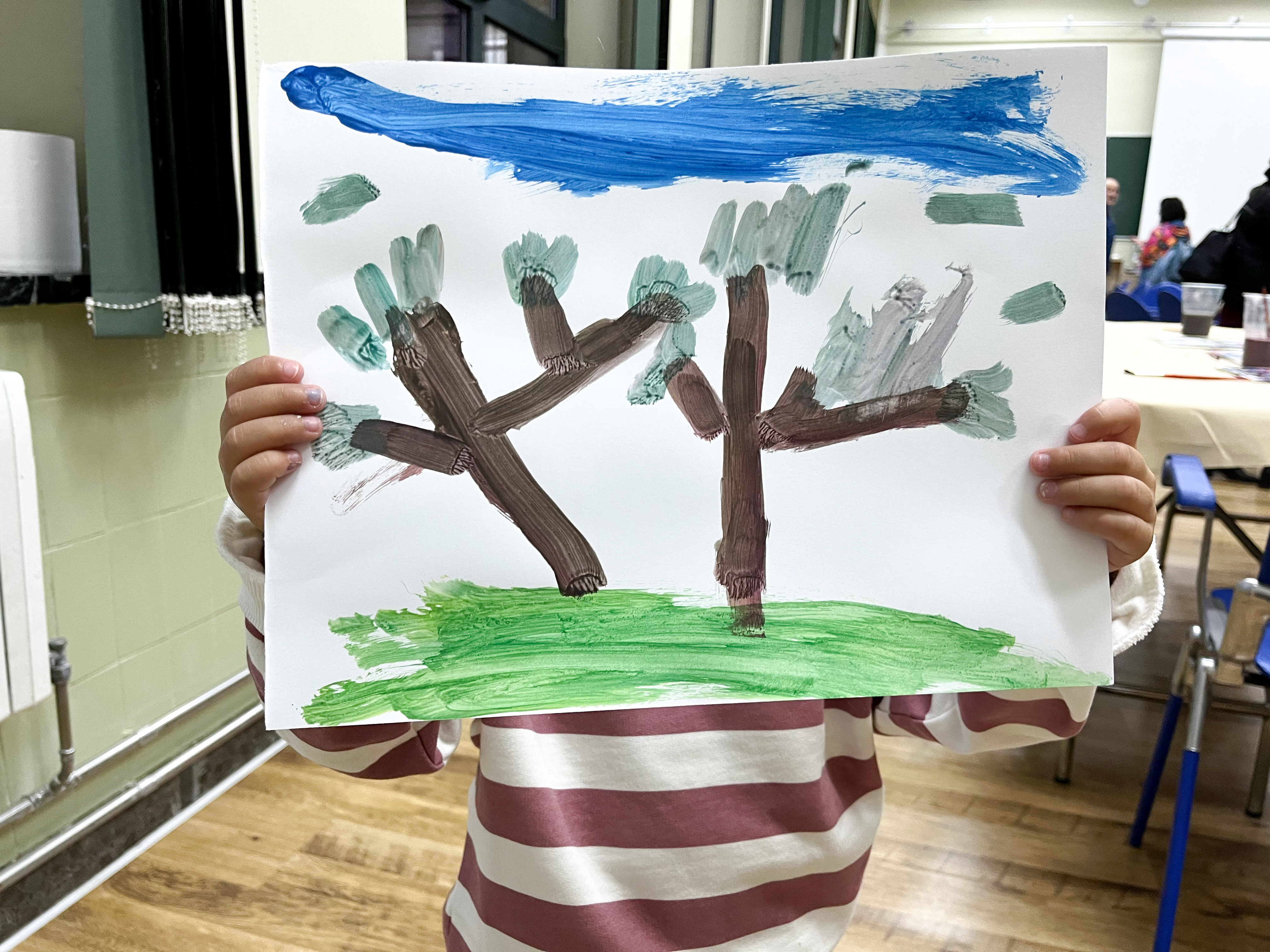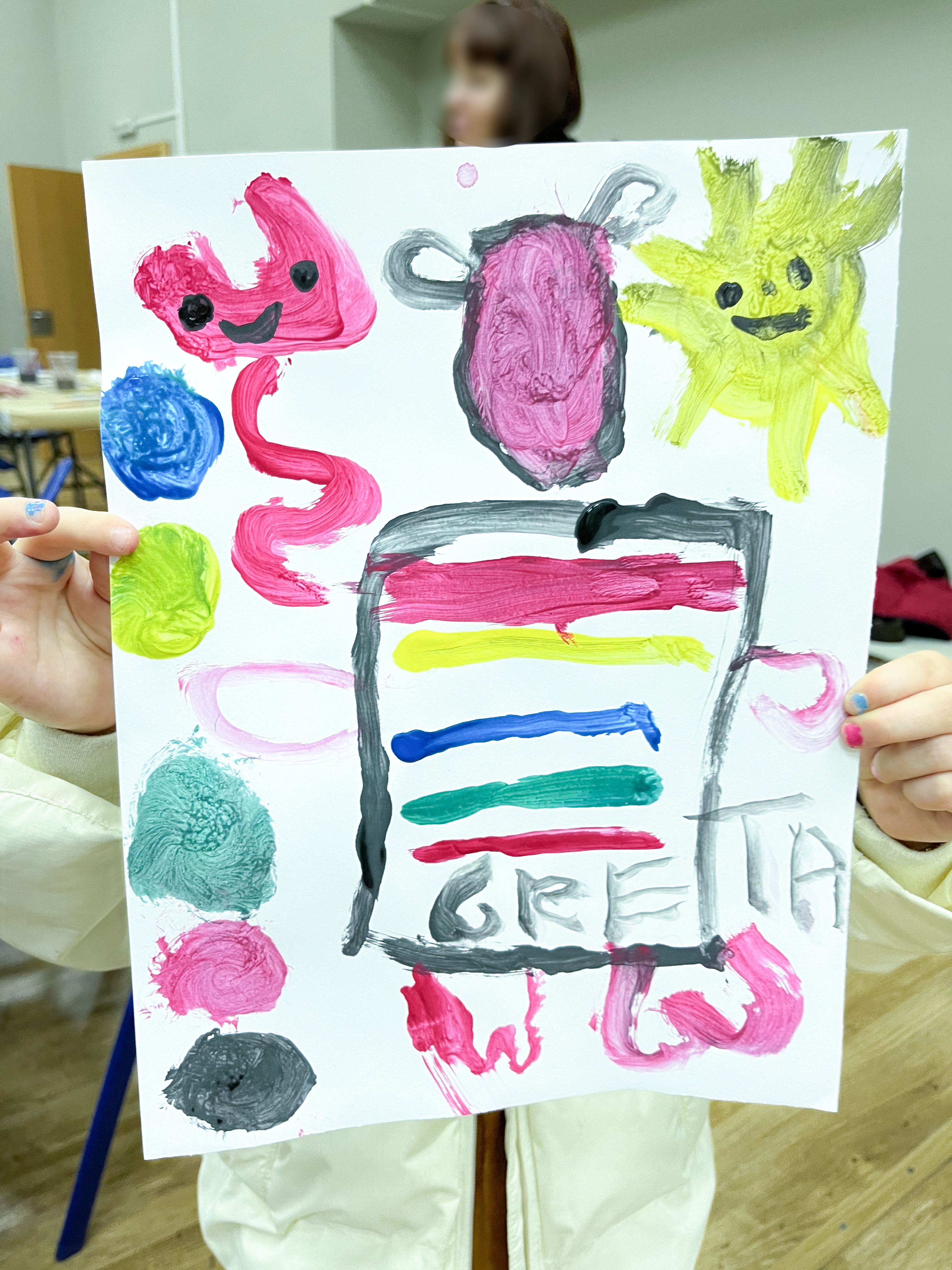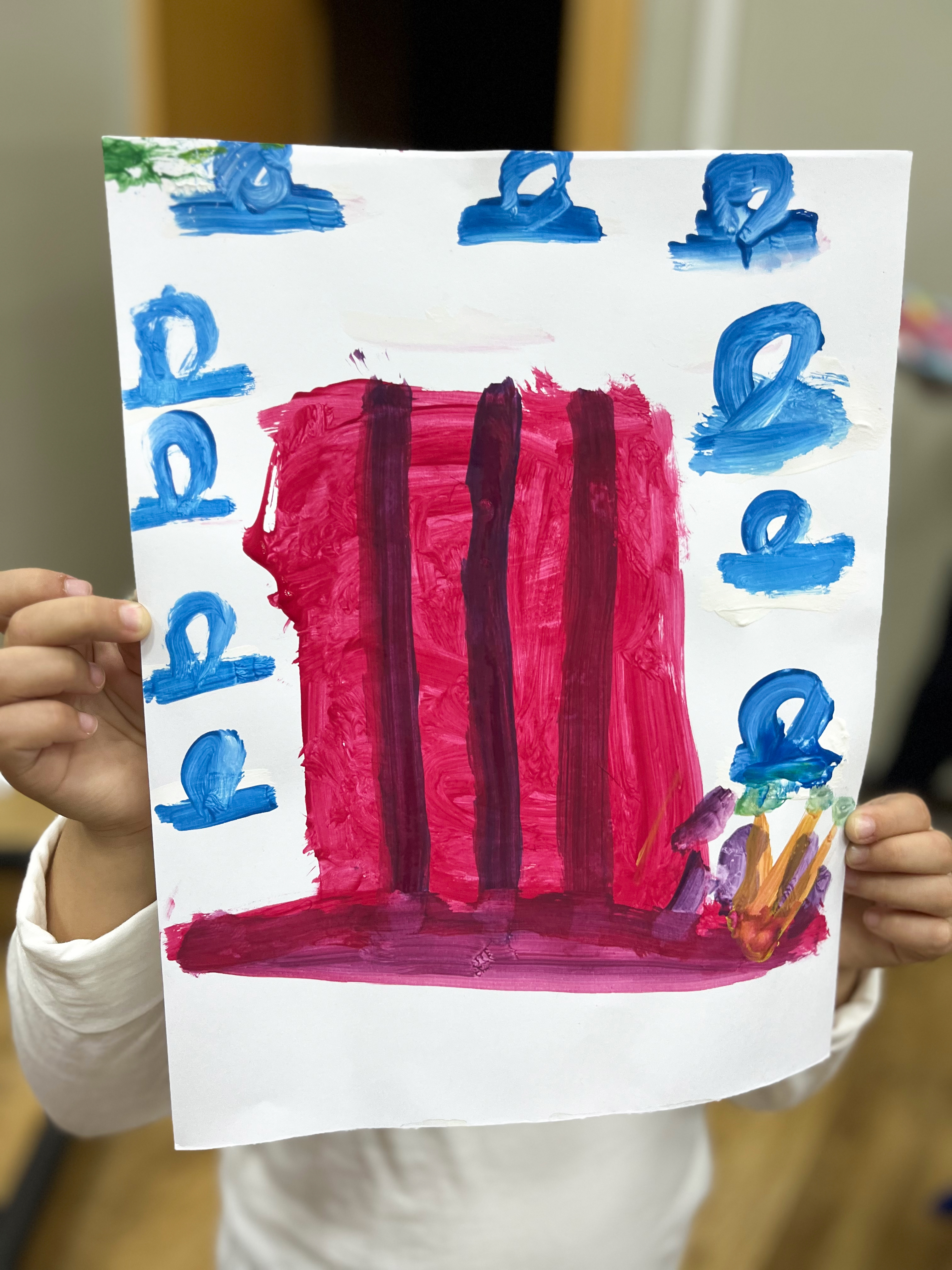 Después, cogimos los pinceles y pintamos el viento: sombreros voladores, árboles con hojas y ramas en movimiento, ¡y colores al aire!