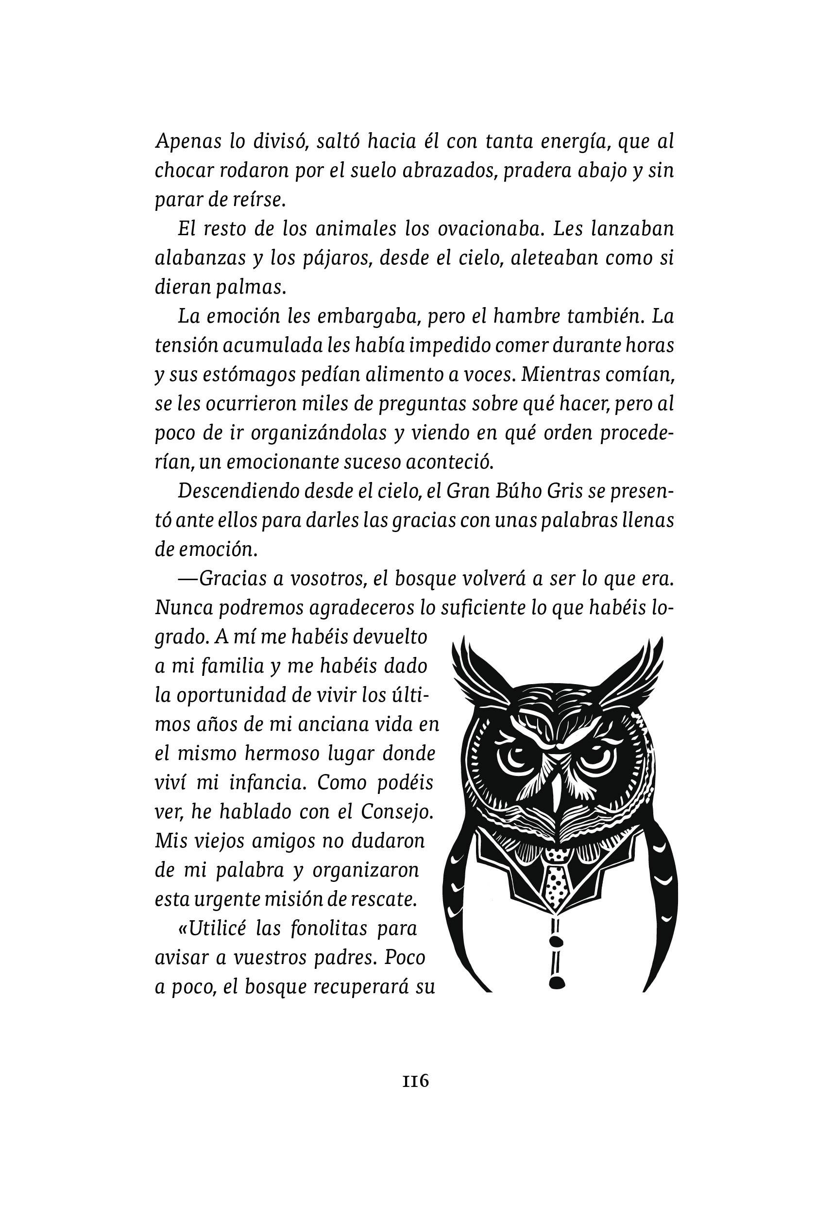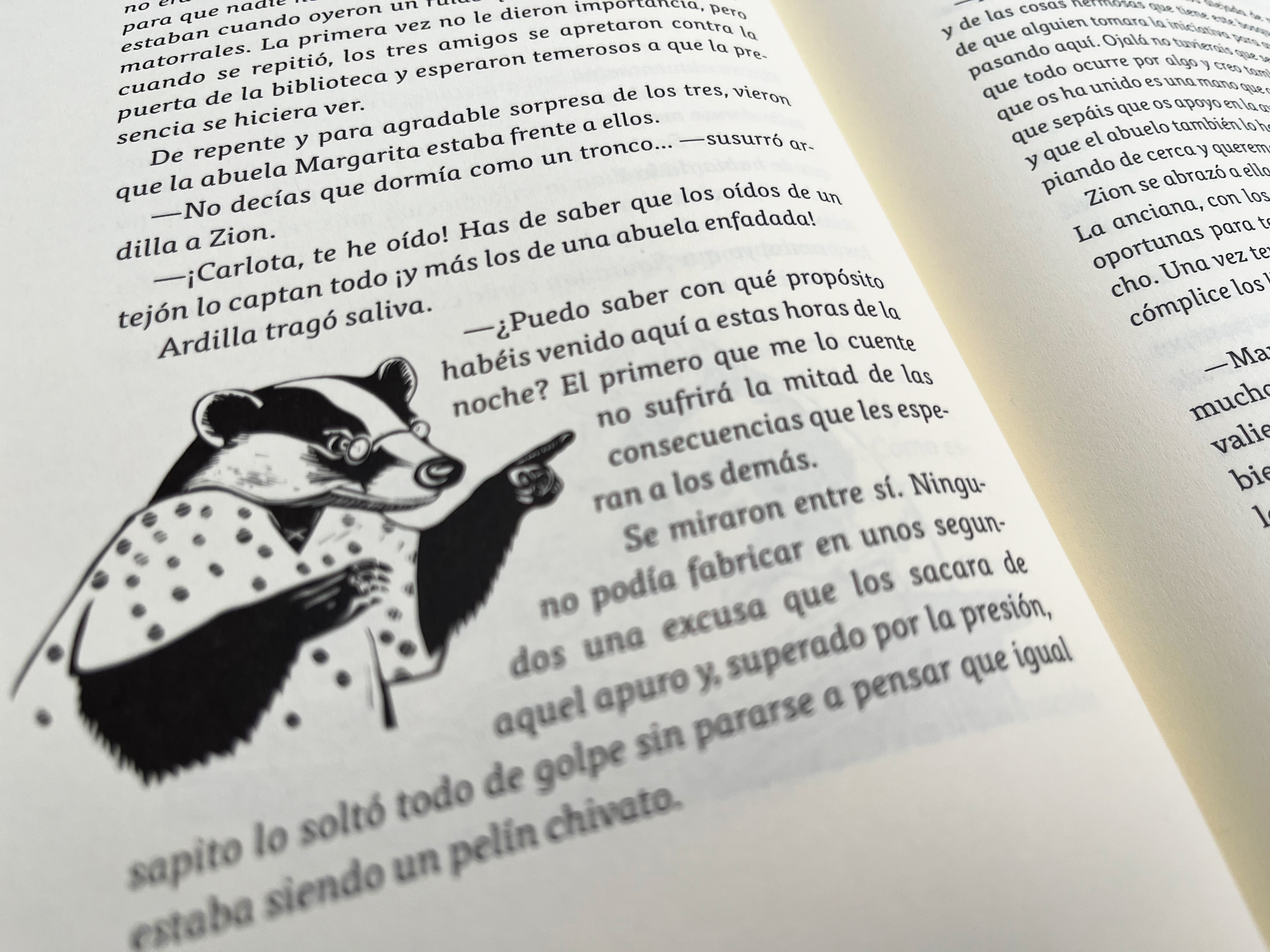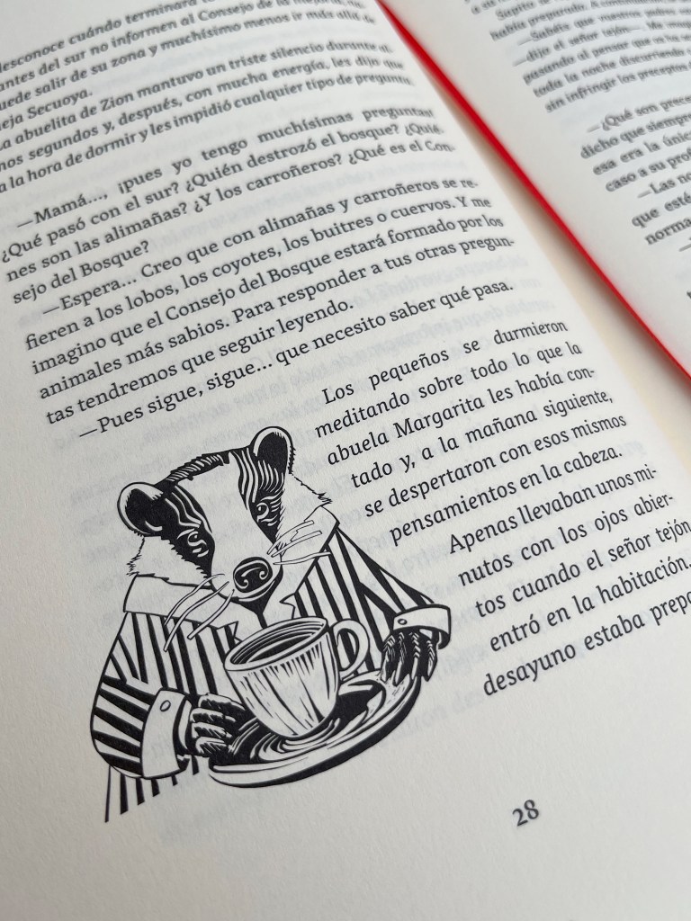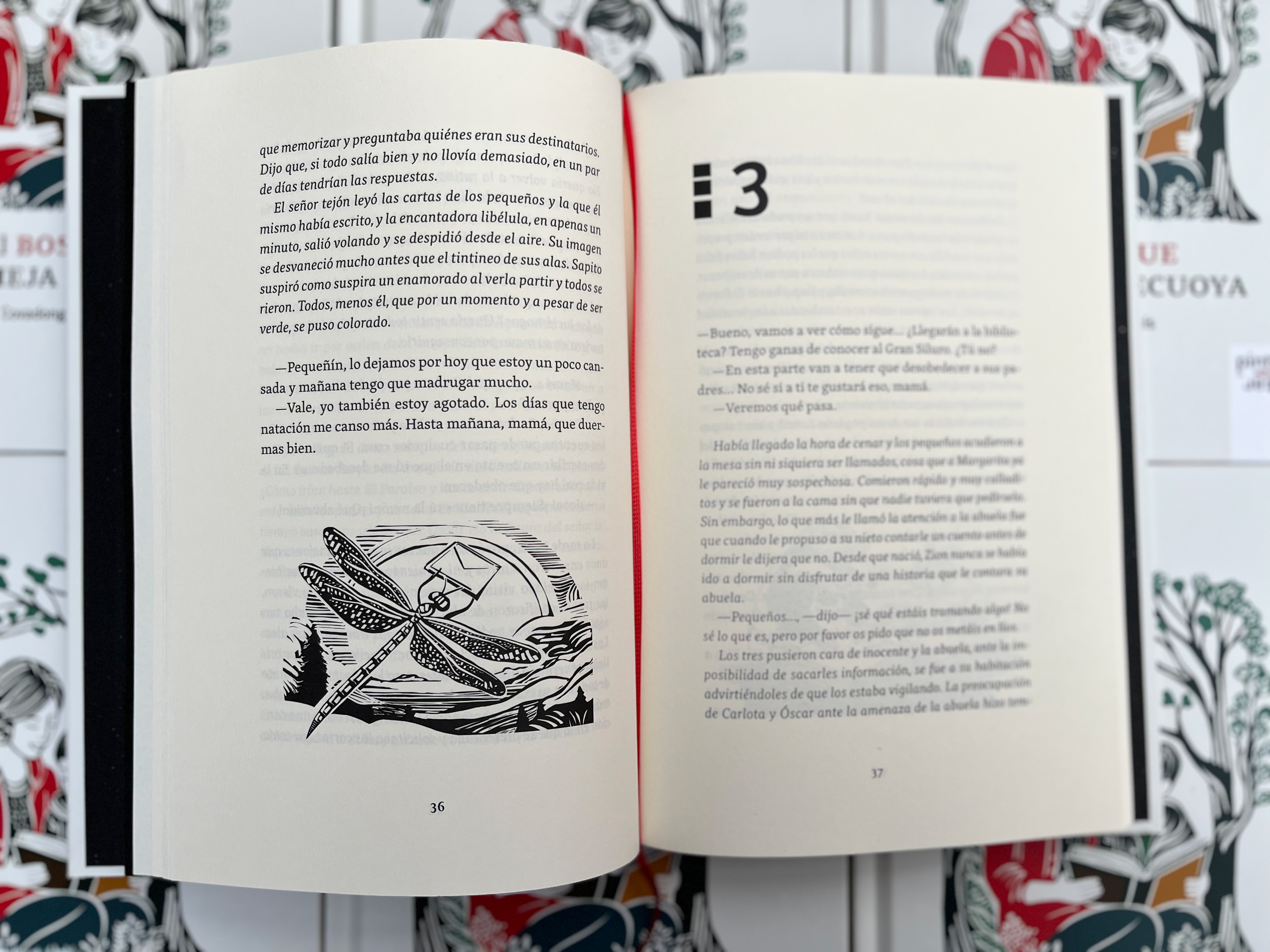 Además, la maquetación cuidadosamente diseñada enriquece aún más la experiencia de lectura, permitiendo a los lectores navegar con fluidez entre los distintos niveles narrativos. Los diálogos entre Mario y su madre, que enmarcan la lectura compartida, se presentan en letra regular, mientras que la historia del bosque de la vieja secuoya, el cuento dentro del libro, aparece en cursiva. Este contraste tipográfico ayuda a distinguir ambos planos narrativos, alternando armoniosamente entre la aventura de los animales protagonistas y el vínculo lector entre madre e hijo.